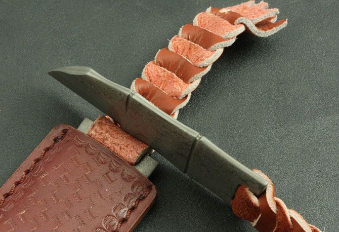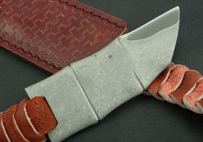 全 长:100mm 刃 长:40mm 柄 长:60mm 刃 宽:33mm 刃 厚:5mm 刃 材:大马士革 重 量:112g(含包装) 硬 度:58HRC 表 面:钢本色 柄 材:一体钢 锁 型:定锁 其 他:配牛皮套和硬纸盒