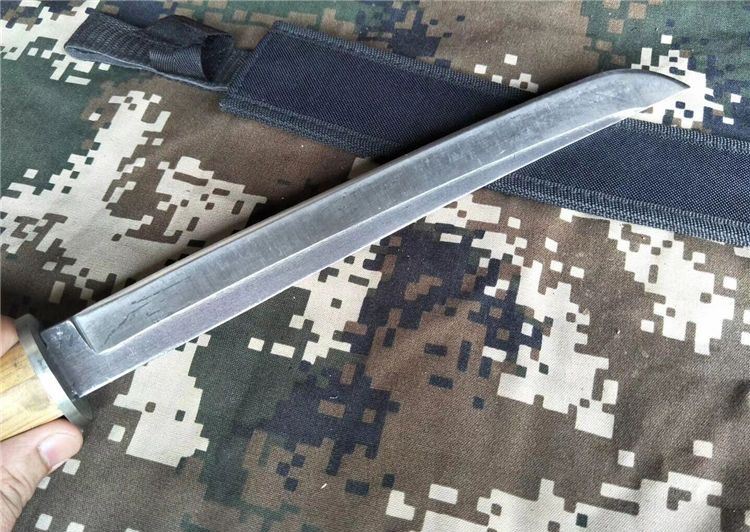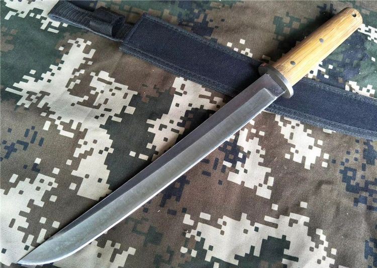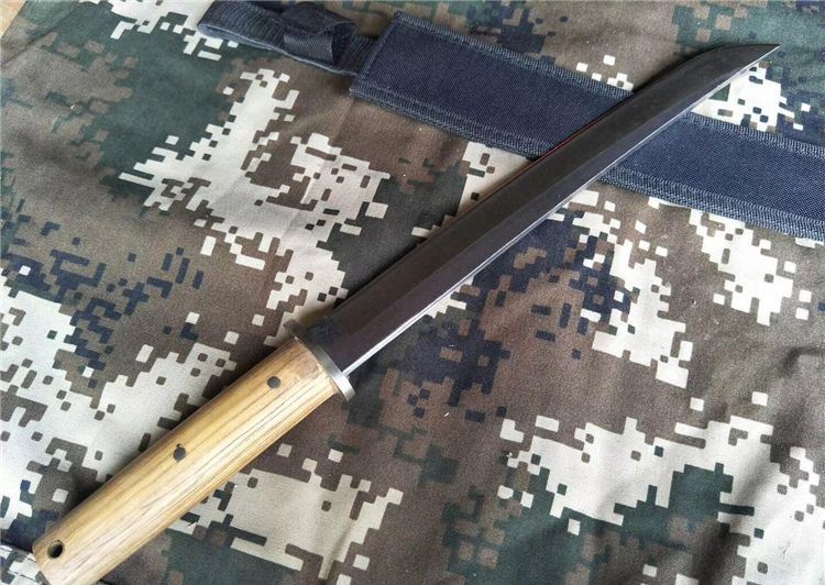 手工锻炼三美武士刀长款 全 长: 42cm 刃 长: 29cm 柄 长:12.7cm 刃 厚: 5mm 刃 材: 不锈钢 硬 度: 58HRC 重 量: 0.85kg 表 面: 氧化黑 柄 材: 坚木 刀 鞘: 尼龙 工 艺: 手工锻炼