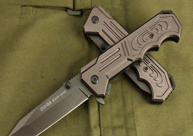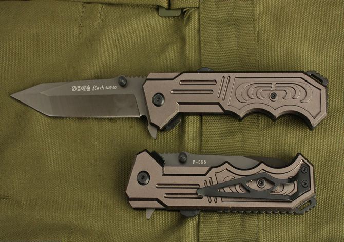 SOG-555战术折刀 全 长: 23cm 刃 长: 10cm 刃 宽: 2.8cm(最宽处) 闭 合: 13cm(柄长) 刃 材: 440C 硬 度: 56HRC 刃 厚: 0.3cm 净 重: 200克 毛 重:210克 柄 材: 合金铝 表 面: 镀钛 锁 闭: 助力