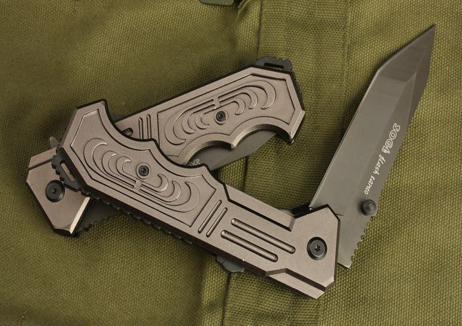 全 长: 23cm 刃 长: 10cm 刃 宽: 2.8cm(最宽处) 闭 合: 13cm(柄长) 刃 材: 440C 硬 度: 56HRC 刃 厚: 0.3cm 净 重: 200克 毛 重:210克 柄 材: 合金铝 表 面: 镀钛 锁 闭: 助力