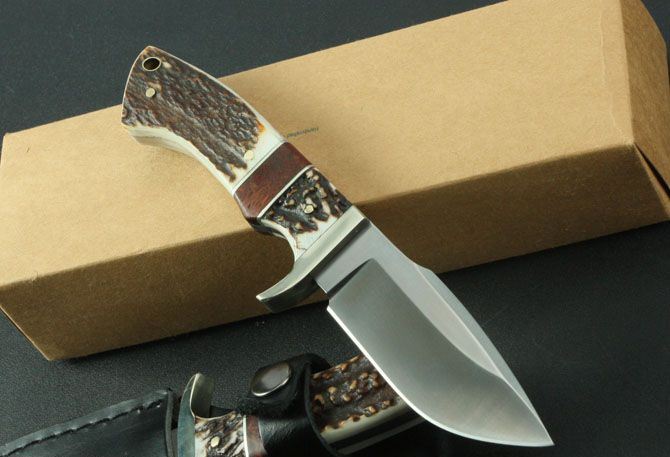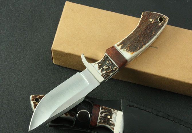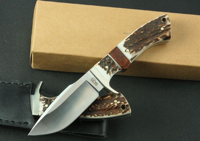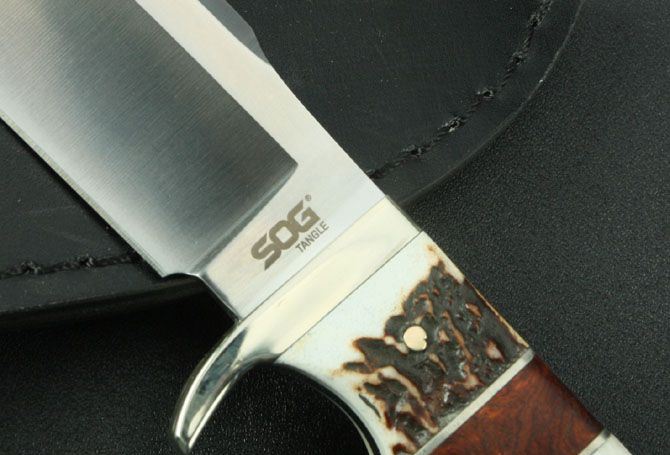 SOG—红影鹿小直 全 长:212mm 刃 长:90mm 柄 长:112mm 刃 宽:33mm 刃 厚:4.3mm 刃 材:9Cr13Wov 重 量:290g(含包装) 硬 度:59HRC{真空热处理) 表 面:砂光 柄 材:白铜头+鹿角+红影 锁 型:定锁 其 他:配皮套