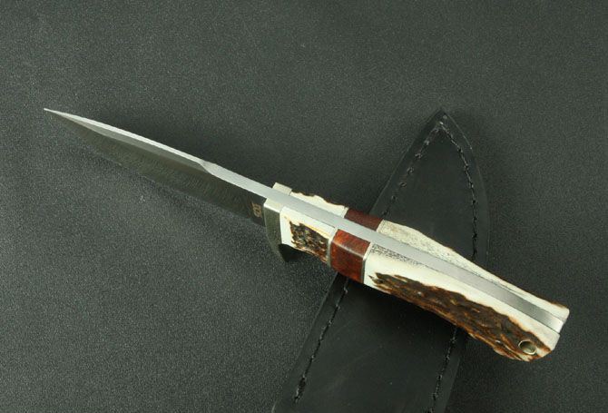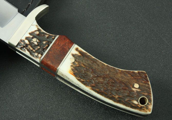 全 长:212mm 刃 长:90mm 柄 长:112mm 刃 宽:33mm 刃 厚:4.3mm 刃 材:9Cr13Wov 重 量:290g(含包装) 硬 度:59HRC{真空热处理) 表 面:砂光 柄 材:白铜头+鹿角+红影 锁 型:定锁 其 他:配皮套