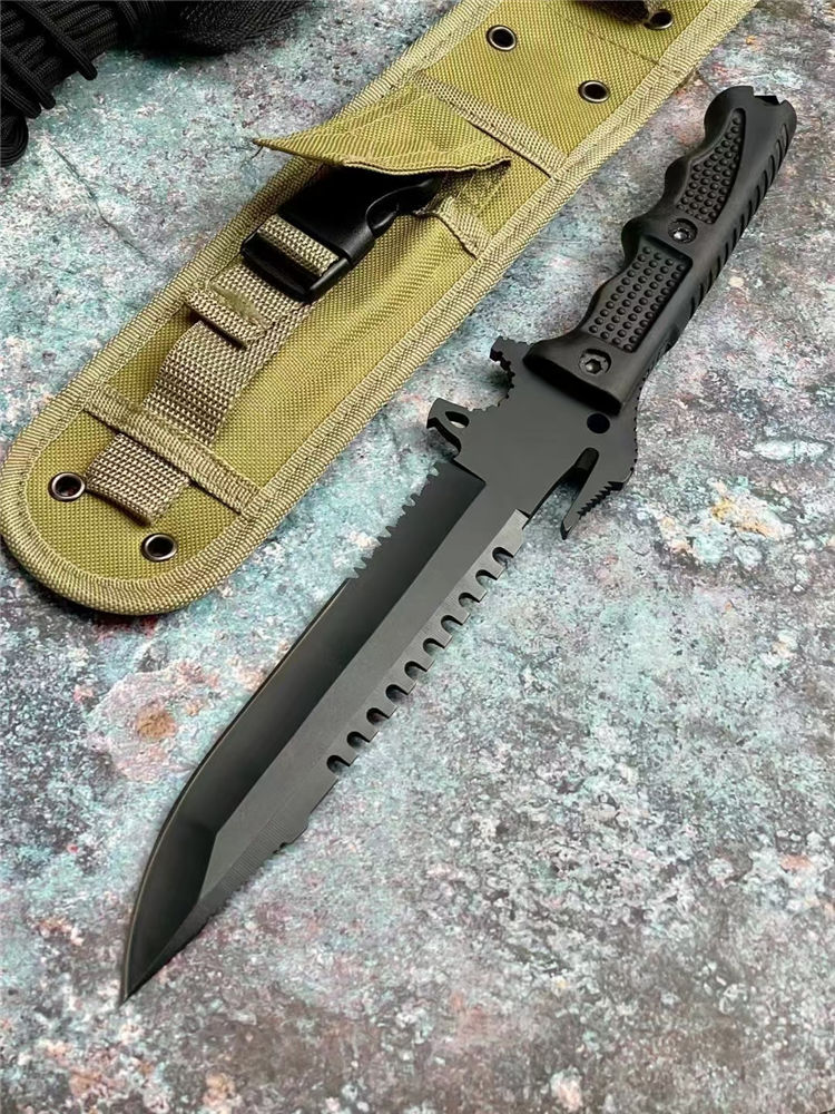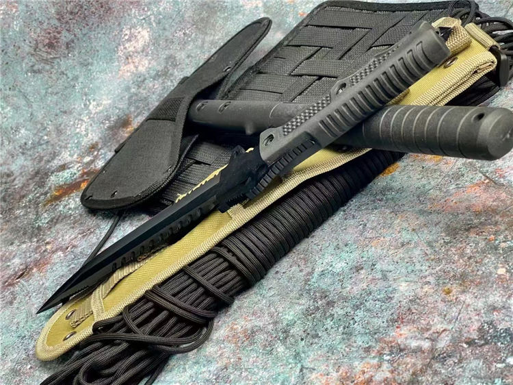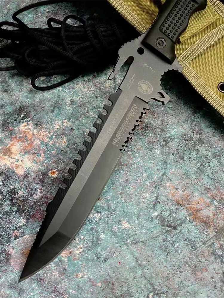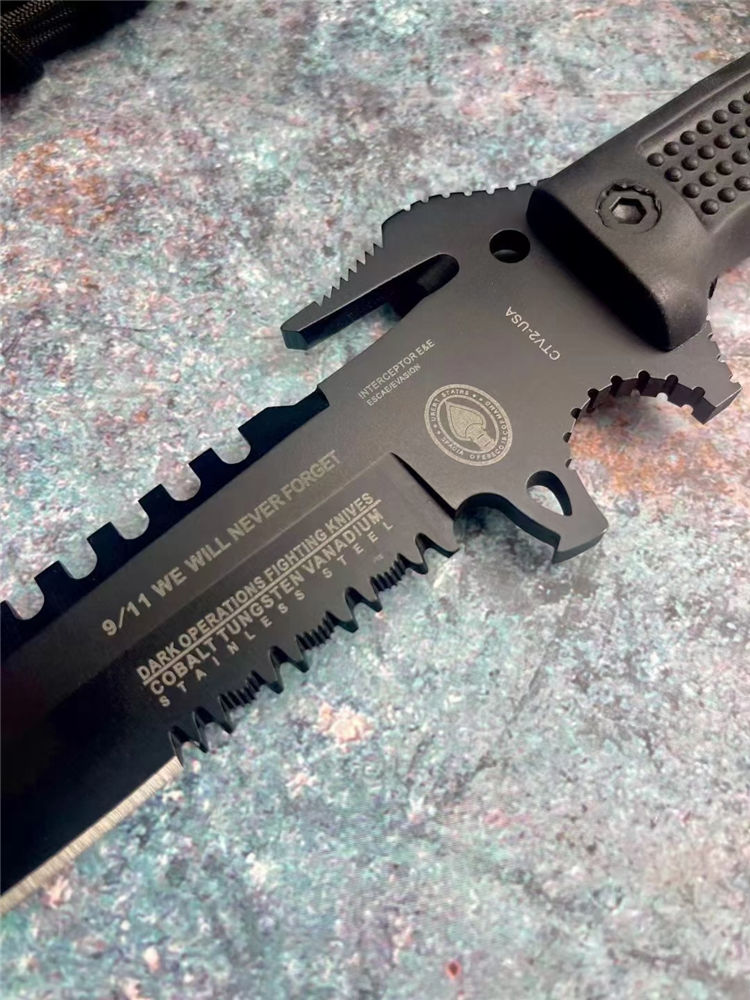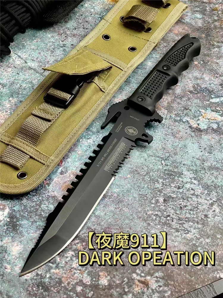 夜魔911直刀防滑柄 全长:360mm 刃长:185mm 柄长:135mm 刃宽:35mm 刃厚:5.7mm 刃材:N690高碳钢 刀重:410g 硬度:59-60HRC 表面:黑钛 柄材:一体钢+橡塑 结构:一龙体骨 包装:尼龙刀套