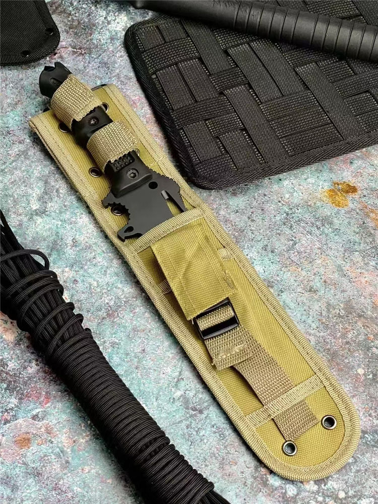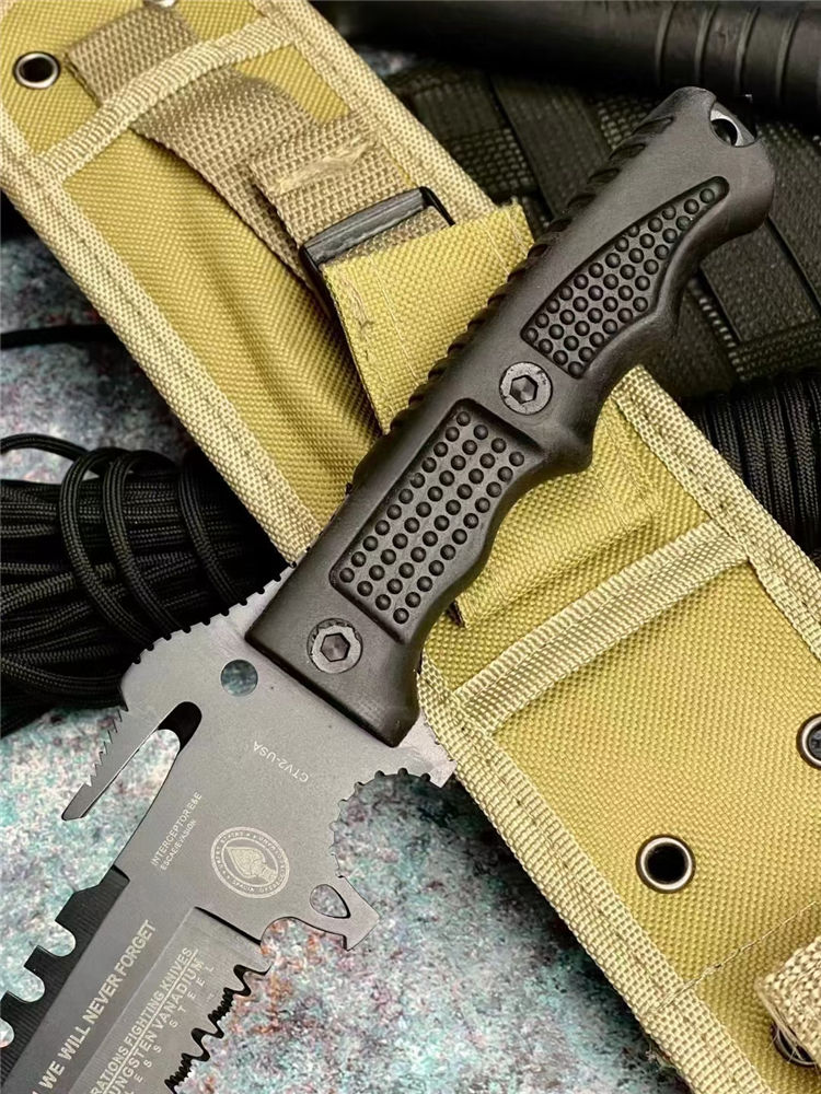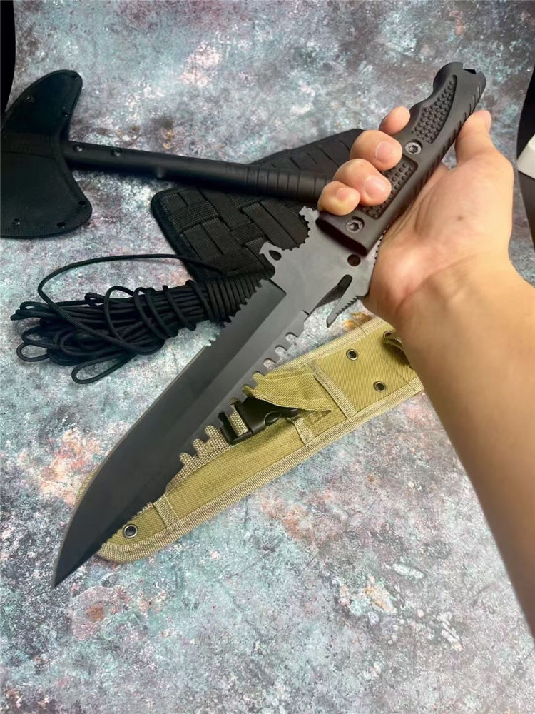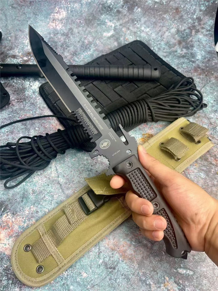 夜魔911直刀防滑柄 全长:360mm 刃长:185mm 柄长:135mm 刃宽:35mm 刃厚:5.7mm 刃材:N690高碳钢 刀重:410g 硬度:59-60HRC 表面:黑钛 柄材:一体钢+橡塑 结构:一龙体骨 包装:尼龙刀套