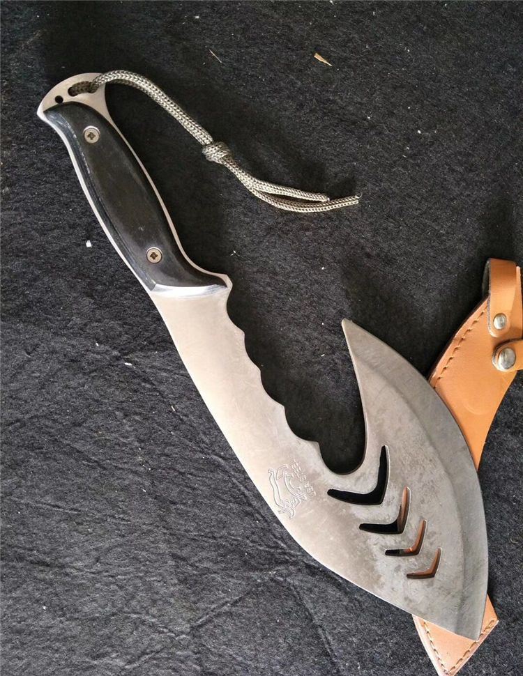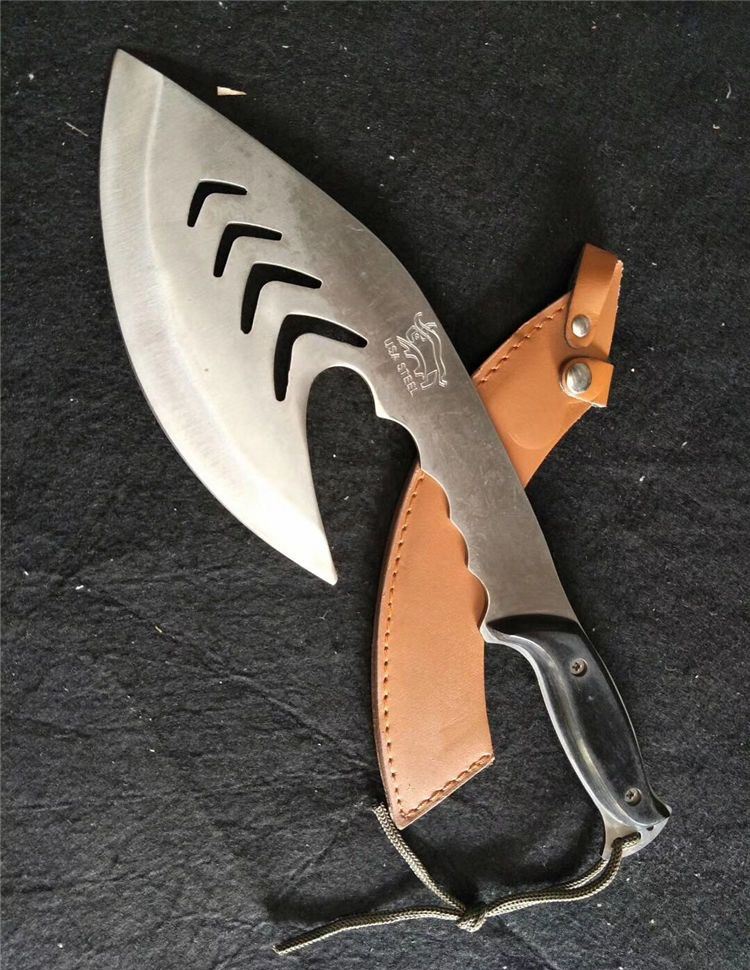 全长:20.5cm 刃宽:11cm 刃厚:2.5cm 刃材:5CR13 硬度:55HRC 表面:砂光 柄材:彩木 柄长:12 净重:600克 毛重:650克 刀鞘:皮套