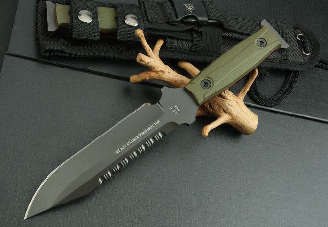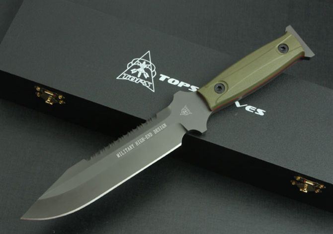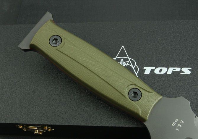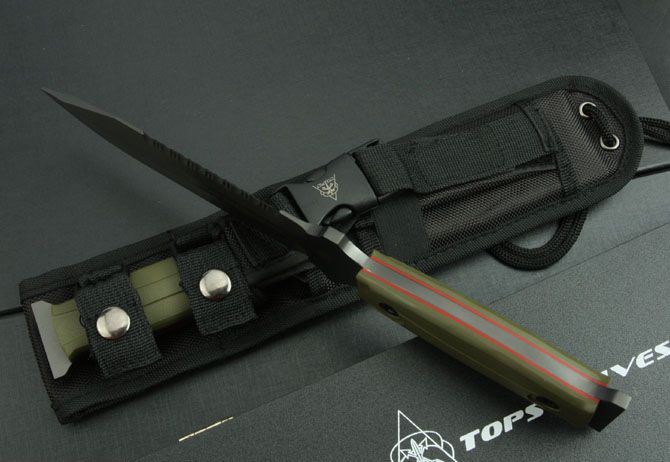 精仿TOPS秃鹰直刀 全 长:303mm 刃 长:150mm 柄 长:115mm 刃 宽:32mm 刃 厚:5.5mm 刃 材:7Cr17 重 量:520g(含皮套) 硬 度:57-58HRC 表 面:镀钛 柄 材:双色G10 锁 型:定锁 其 他:配木盒和尼龙战术刀套