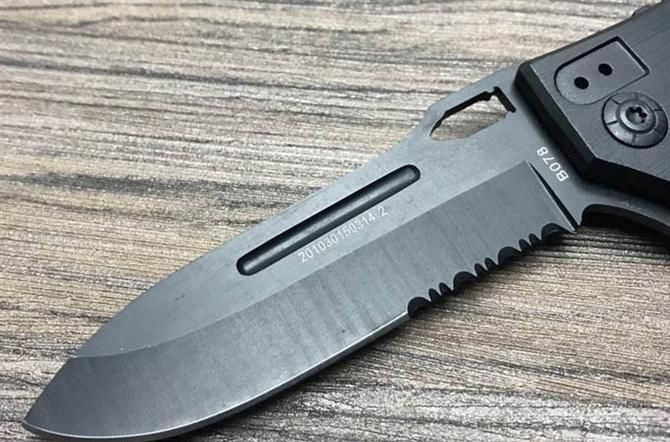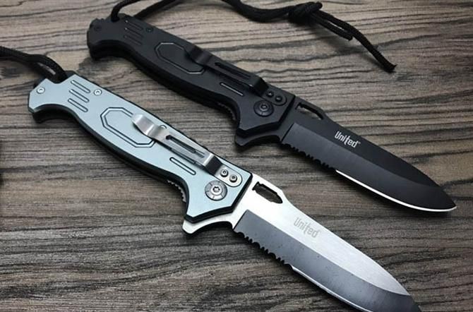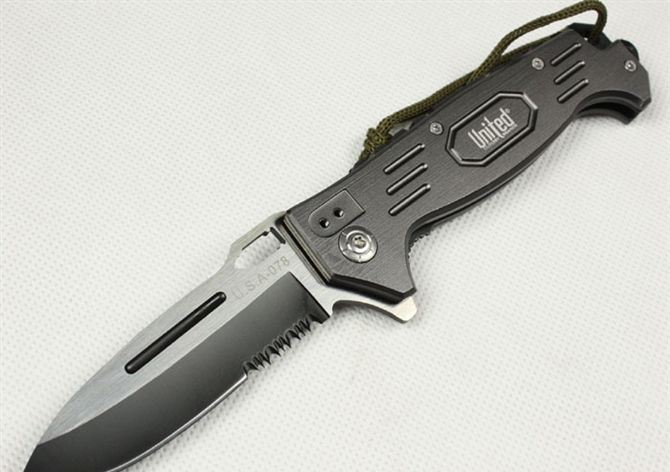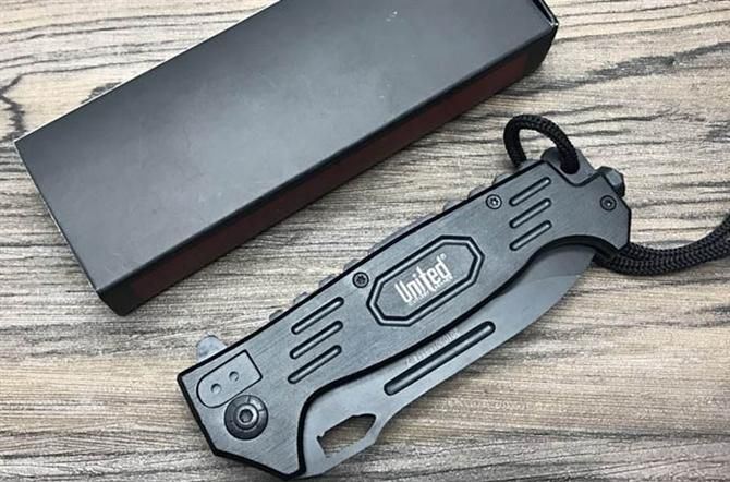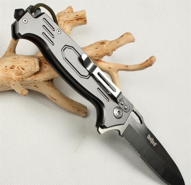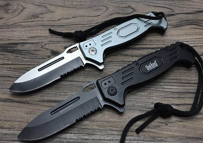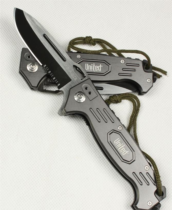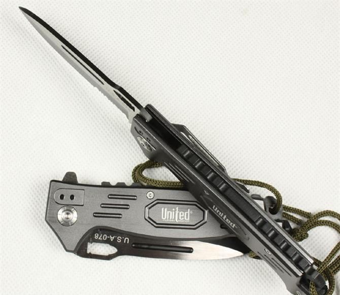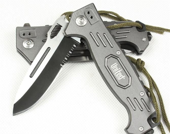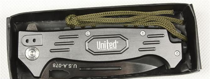 UC枪神折刀 刃材:440 硬度: 57HRC 全长:21.5CM 刃长:9CM 刃厚: 0.28CM 刃宽:2.5CM (最宽处) 柄长: 12.5CM 涂层:发黑+拉砂 柄材: 铝 重量:155克 锁定:线