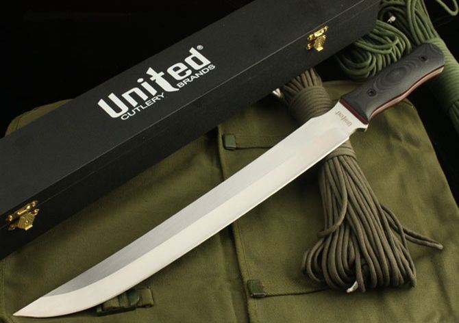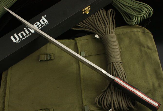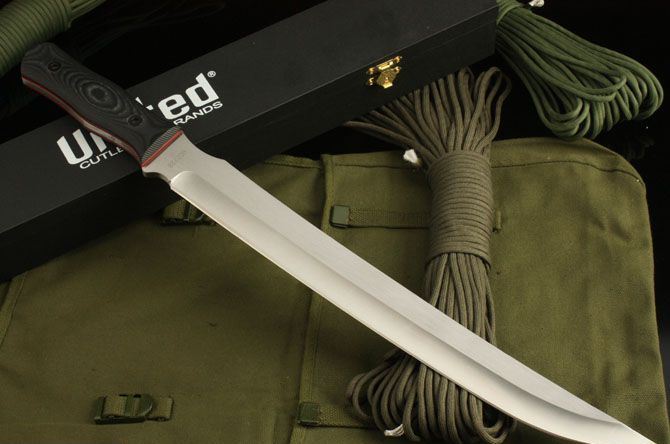 UC-2728长刀 全长:49cm 刃长:36.5cm 柄长:12.5cm 刃厚:6mm 刃宽: 3.8cm 刃材: 5Cr13 柄材: 龙骨结构 硬度: 57HRC 净重:690克 毛重:1130克(含包装物) 表面处理:砂光 本产品由UC(联合刀具)公司设计。国内代工出口日本。选料、做工要求严格,手工精细,此刀深受刀友们共赏和收藏。