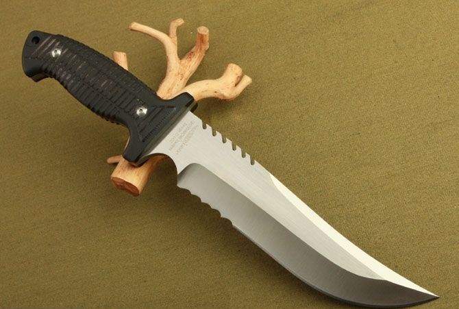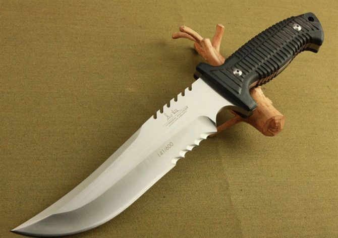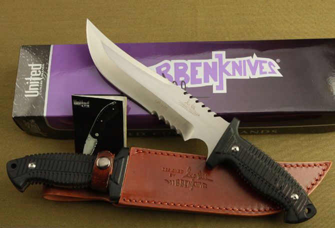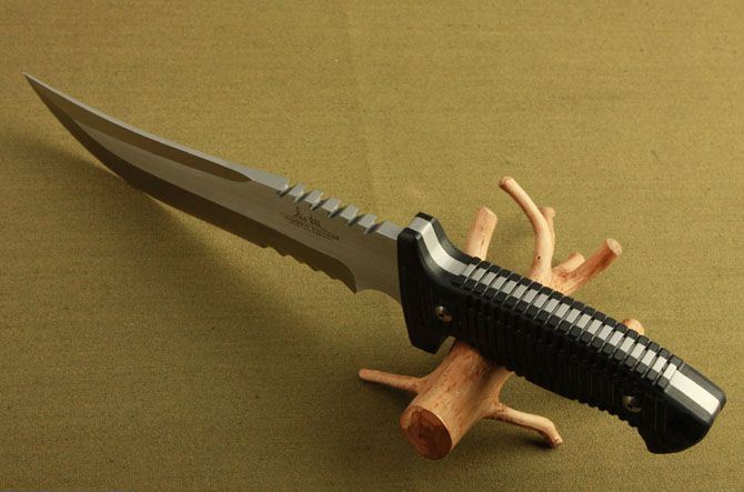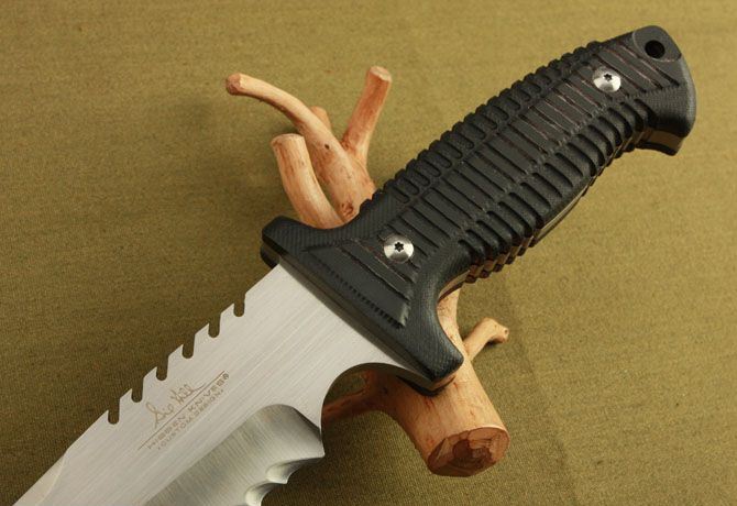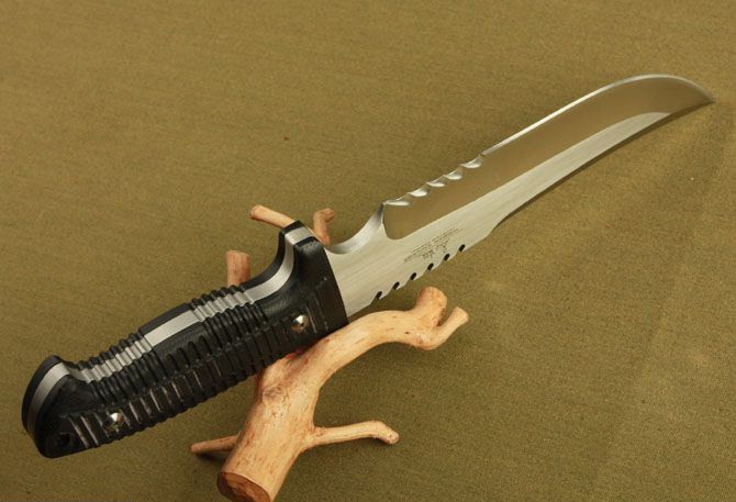 联合刀具—2999签名版 全 长:340mm 刃 长:210mm 刃 宽:48mm 刃 厚:7.4mm 刃 材:7Cr17 硬 度:58HRC{真空热处理) 重 量:790g(含包装) 表 面: 砂光 柄 材:黑色G10 刀 鞘:皮套