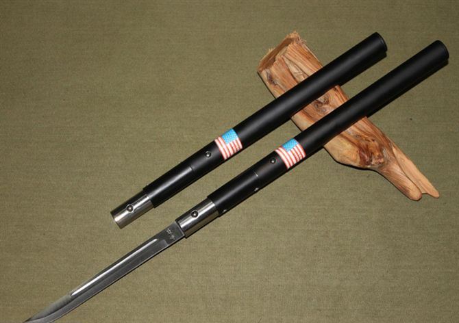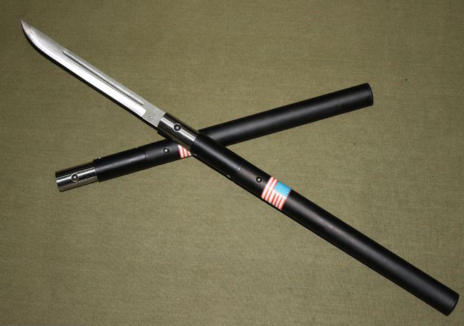 组合警棍博击刀-小号珠锁式 完全接上长度:55.5CM 刃长:15.5M 完全合上长度:36CM 管径:2.5CM 刀厚:0.32CM 净重:220g 硬度:54HRC 刀材质:420不锈钢 铁制外壳. 刀刃白色,弹珠式锁定装置. 配送尼龙刀套。