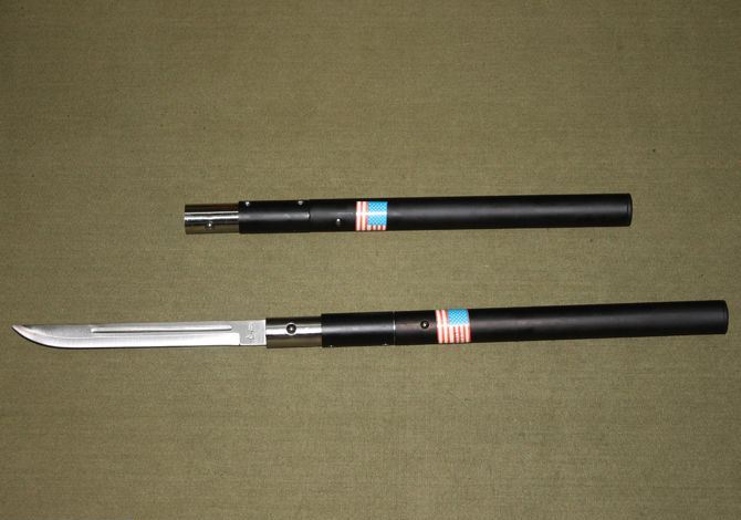 完全接上长度:55.5CM 刃长:15.5M 完全合上长度:36CM 管径:2.5CM 刀厚:0.32CM 净重:220g 硬度:54HRC 刀材质:420不锈钢 铁制外壳. 刀刃白色,弹珠式锁定装置. 配送尼龙刀套。