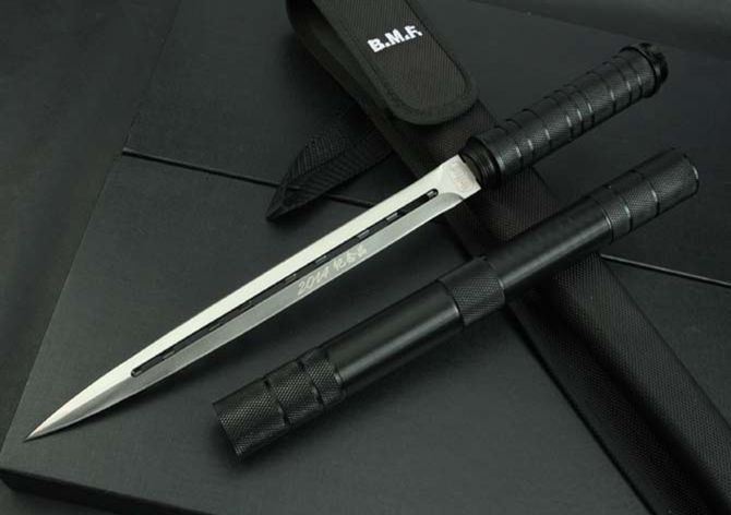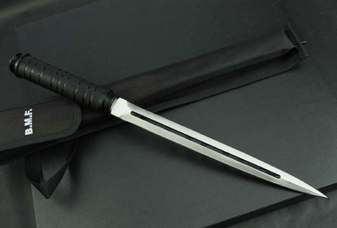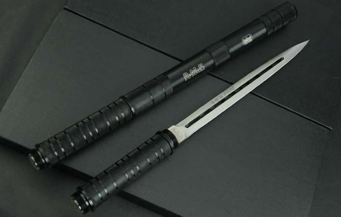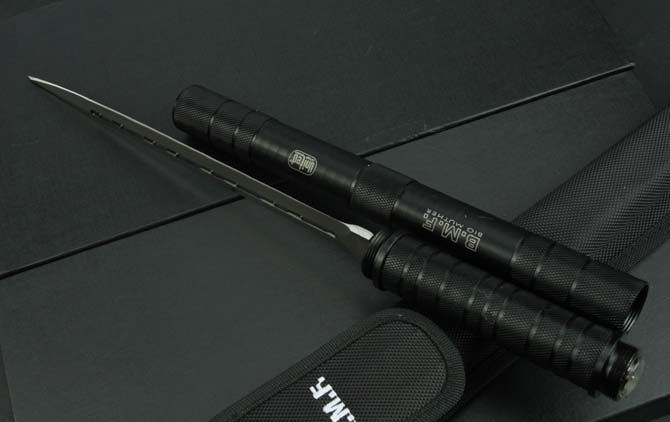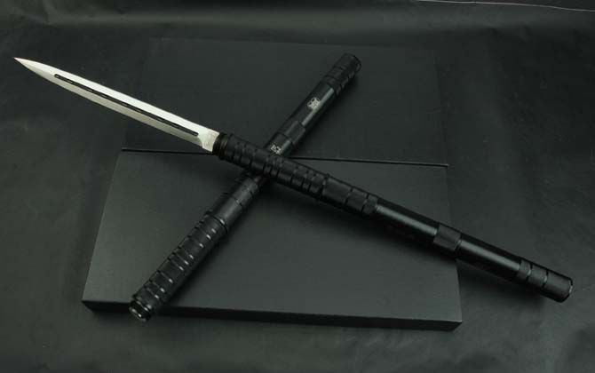 联合刀具—2014纪念品双锋棍刀 全长:39.5CM 反接:65.8CM 刃长: 24.5CM 刃厚:4.6CM 刃材:3Cr13 管材:铁管 管径: 3CM 重量: 570g(含包装) 硬度: 56HRC