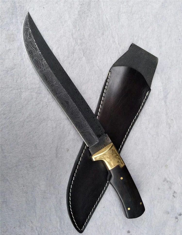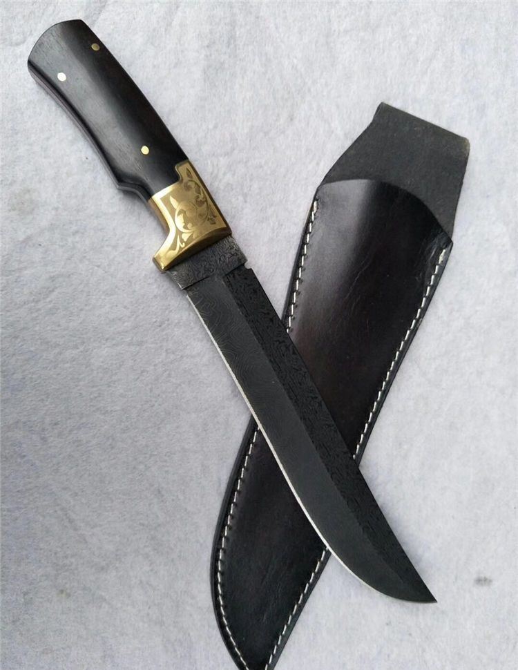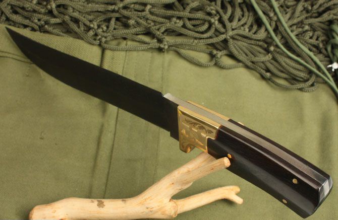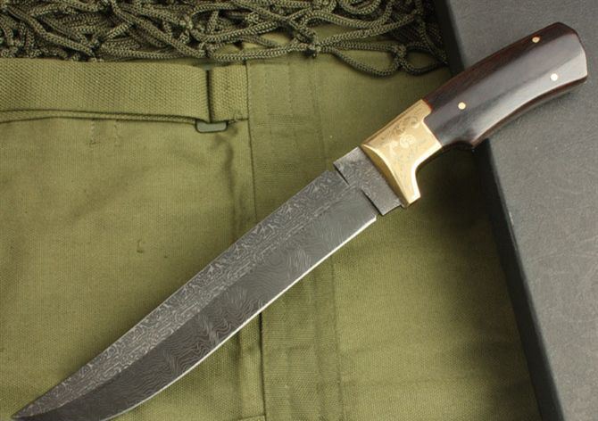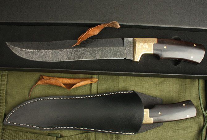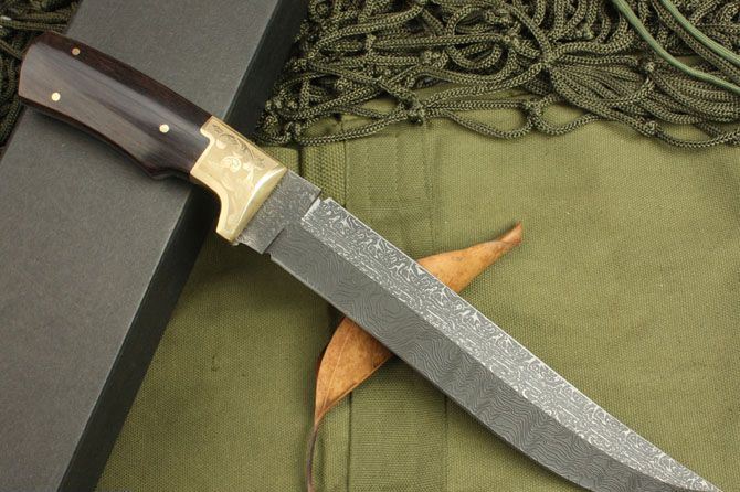全长:34cm 刃长:23cm 刃宽:3.3cm (最宽处) 刃厚:0.58cm 刃材:新型波纹钢,手工锻打,档次相当于大马士革钢,不刮花,不变色。 硬度:58HRC 表面:不规则波纹,表面处理方法属于商业秘密 柄材:名贵黑檀木+纯铜 柄长:12cm 刀重:590克 总重:830克(含包装物) 品质:高品质,刃口非常锋利 其他: 刀身贯穿至刀柄末端,用铜钉固定 附件:牛皮刀套