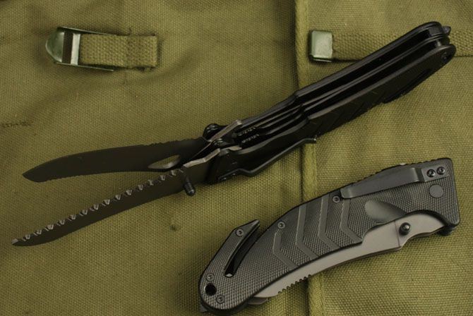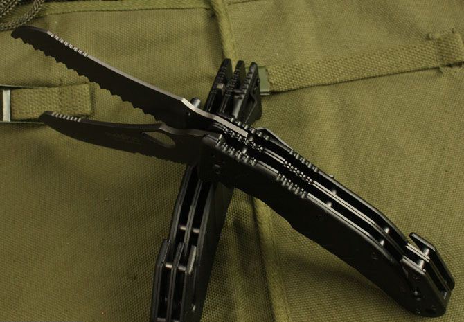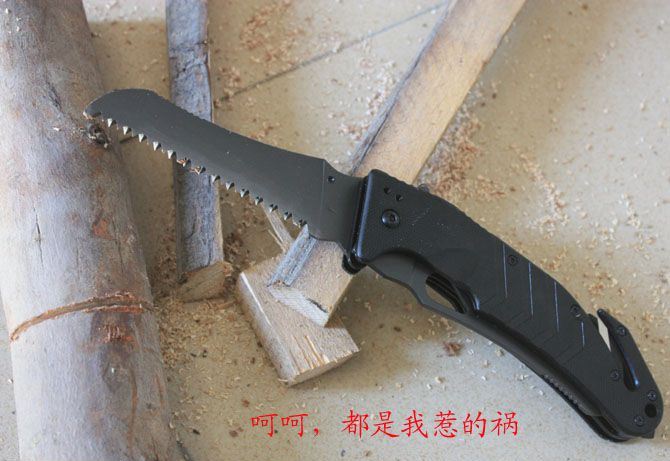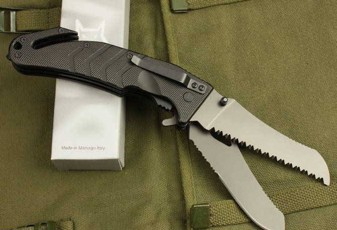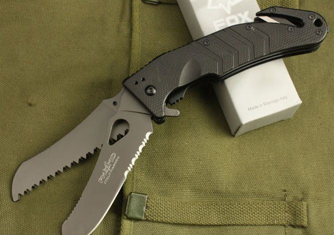 狐狸-两开救生折刀 全长:23cm 刃长:10cm 柄长:13cm 刃厚:2.8mm 刃宽: 0.25cm 刃材: 5Cr13 柄材: 铝柄 硬度: 56HRC 净重:220克 毛重:248克 表面处理:氧化钛 锁型:一个边锁,一个快开