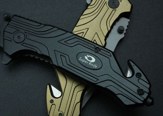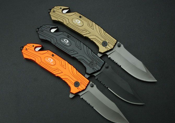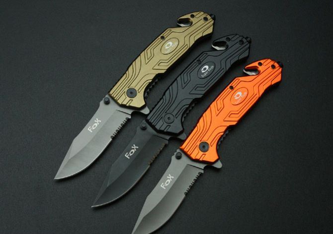 狐狸—K15387折刀 全长:23cm 刃长:9cm 柄长:13cm 刃厚:2.7mm 刃宽: 2.7cm 刃材: 3Cr13 柄材: 铝柄 硬度: 54HRC 净重:200克 毛重:210克 表面处理:镀钛 锁型:侧锁