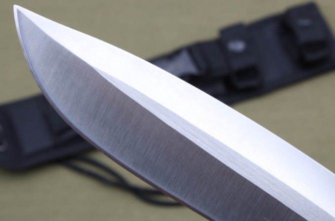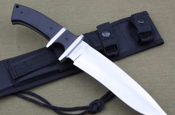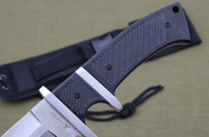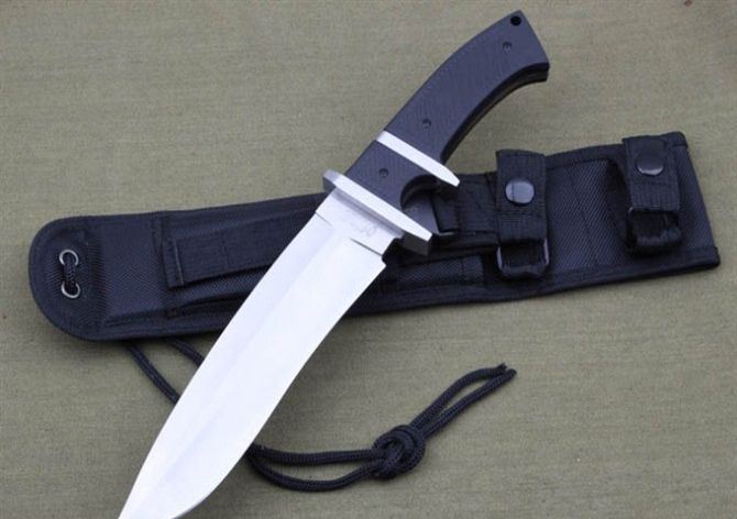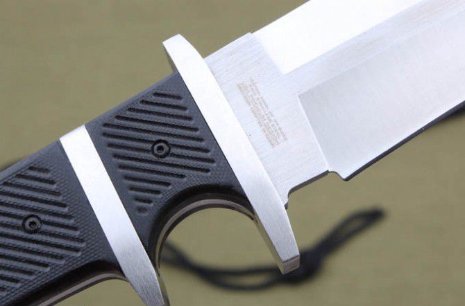 护手TY—27直刀 全 长:330mm 刃 长:194mm 柄 长:136mm 刃 宽:50mm 刃 厚:4.4mm 刃 材:5Cr13Mov 重 量:765g(含包装) 硬 度:57HRC 表 面:沙光 柄 材:双钢头G10 锁 型:定锁 其 他:配牛皮套和彩盒
