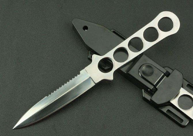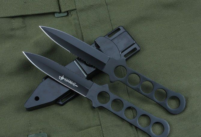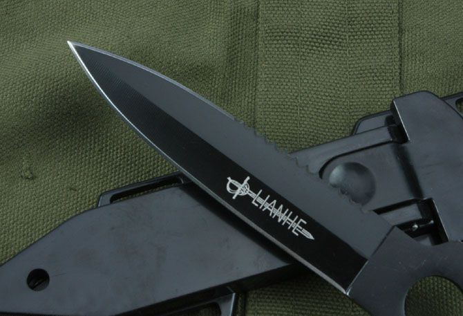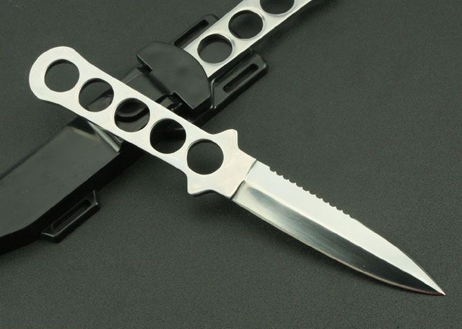 新双锋潜水刀(黑色、白色) 全 长:215mm 刃 长:100mm 柄 长:105mm 刃 宽:23mm 刃 厚:4mm 刃 材:3Cr13Mov 重 量:180g(含包装) 硬 度:56HRC 表 面:氧化黑和镜光 柄 材:全钢 锁 型:定锁 其 他:配白盒和绷带