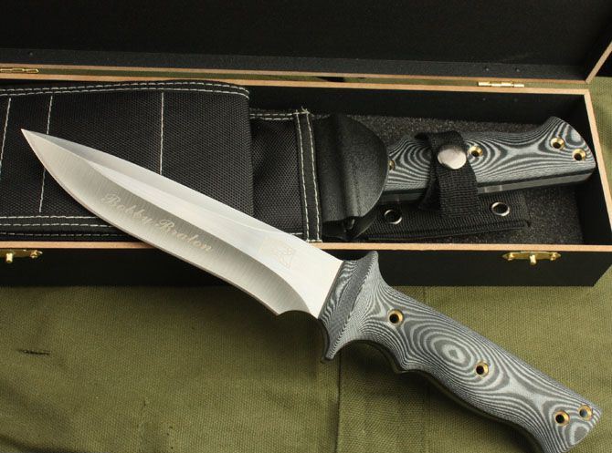 布兰登M2(外贸手签版) 全长:30cm 刃长:16cm 柄长:14cm 刃厚:6mm 刃宽: 3.5cm 刃材: 5Cr13 柄材: 米克塔 硬度: 56HRC 净重:395克 毛重:820克 表面处理:手工砂光 其他:配木盒