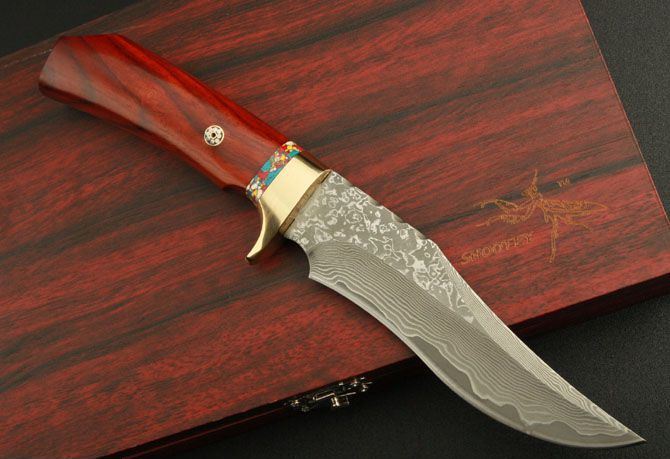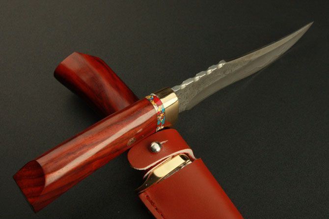 全 长: 24cm 刃 长: 13cm 刃 宽: 3.5cm(最宽处) 柄 长: 11cm 硬 度: 59HRC 刃 厚: 0.37cm 重 量: 670克(含包装) 表 面: 纯手工制造 刃 材: 大马士革 柄 材: 铜+木 其 他: 刃口锋利 大马士革钢花纹和把手木纹及颜色各异,以实物为准