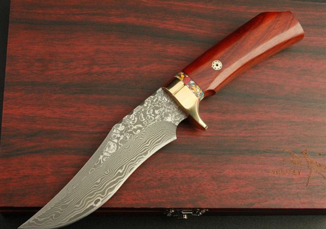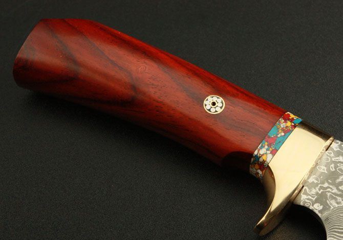 大马革士—螳螂M2 全 长: 24cm 刃 长: 13cm 刃 宽: 3.5cm(最宽处) 柄 长: 11cm 硬 度: 59HRC 刃 厚: 0.37cm 重 量: 670克(含包装) 表 面: 纯手工制造 刃 材: 大马士革 柄 材: 铜+木 其 他: 刃口锋利 大马士革钢花纹和把手木纹及颜色各异,以实物为准