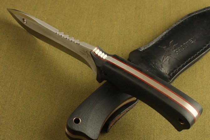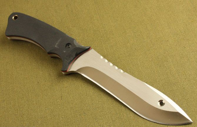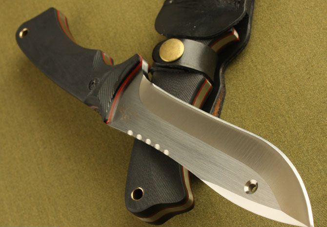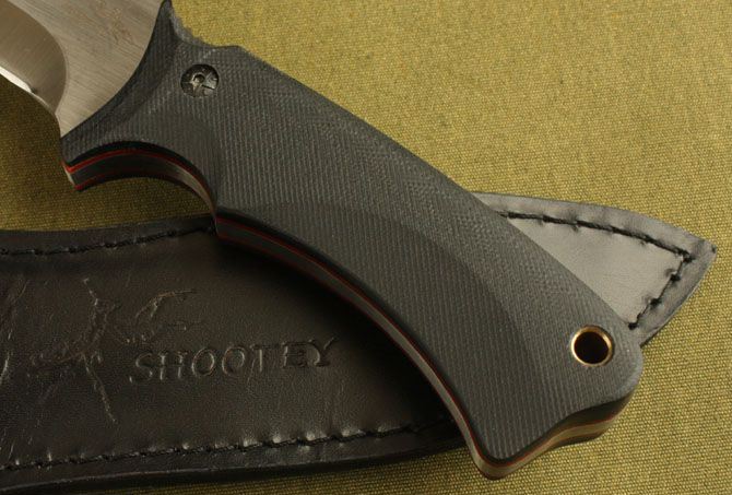 全长: 27.2cm 刃长: 15cm 柄长: 12.5cm 刃厚: 0.57cm 刃材: 8Cr13 硬度:59HRC 柄材: G10 表层:砂光 刀套:牛皮 总重:450克 净重:400克