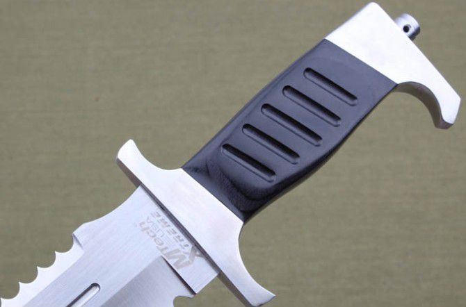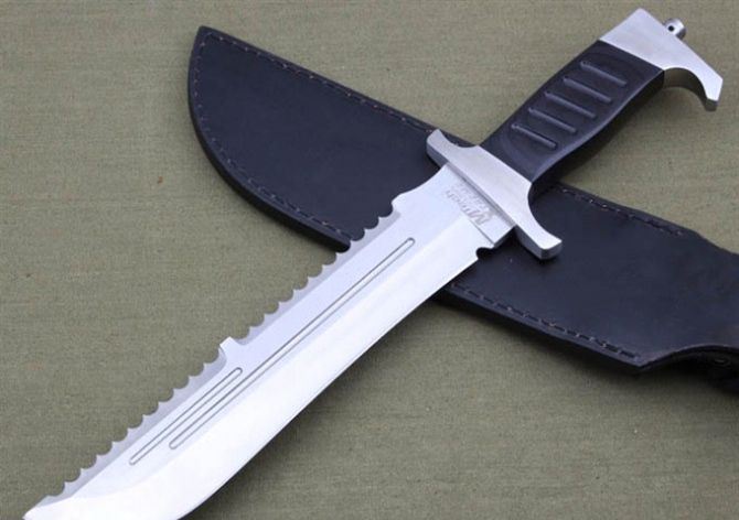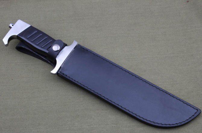 TY—26直刀 全 长:390mm 刃 长:252mm 柄 长:138mm 刃 宽:48mm 刃 厚:6.0mm 刃 材:5Cr13Mov 重 量:986g(含包装) 硬 度:57HRC 表 面:沙光 柄 材:双钢头黑檀木 锁 型:定锁 其 他:配牛皮套和彩盒