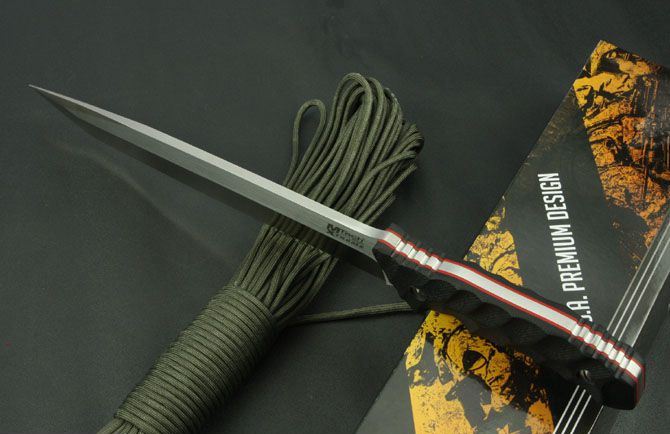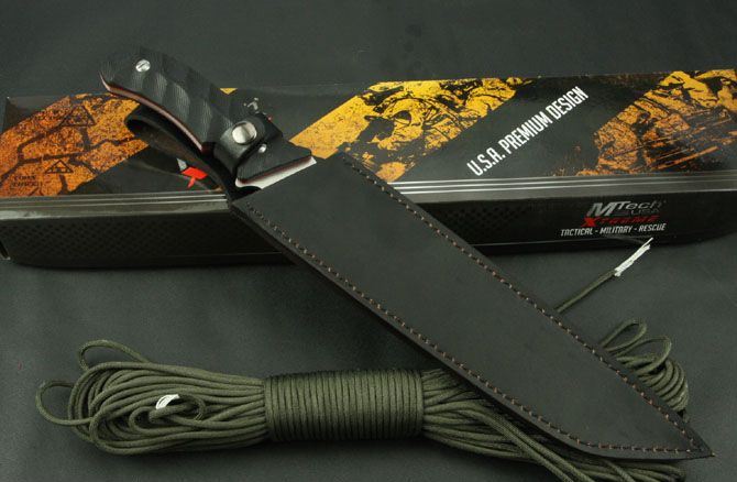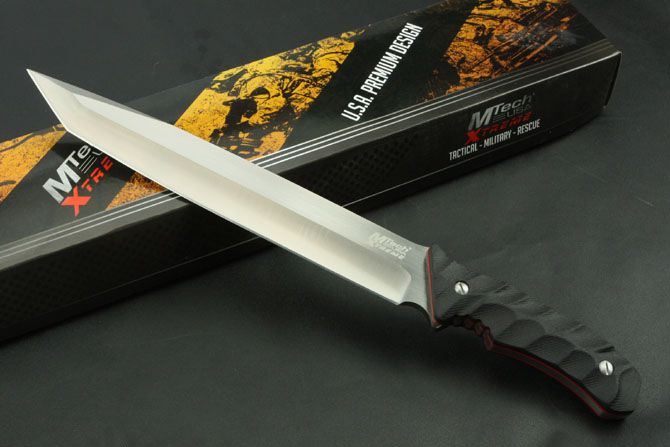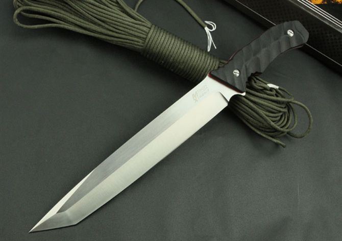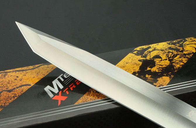 MT-TY03直刀 全 长:400mm 刃 长:255mm 柄 长:140mm 刃 宽:40mm 刃 厚:5.6mm 刃 材:5Cr13Mov 重 量:710g(含包装) 硬 度:57HRC 表 面:砂光 柄 材:双色G10 锁 型:定锁 其 他:配牛皮套和彩盒
