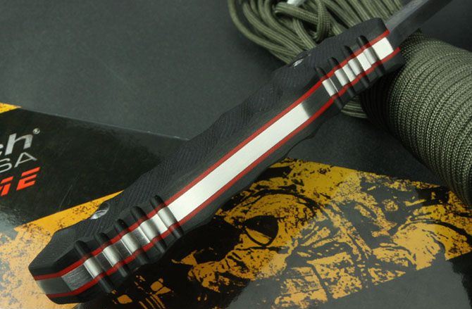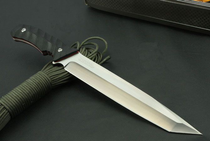 全 长:400mm 刃 长:255mm 柄 长:140mm 刃 宽:40mm 刃 厚:5.6mm 刃 材:5Cr13Mov 重 量:710g(含包装) 硬 度:57HRC 表 面:砂光 柄 材:双色G10 锁 型:定锁 其 他:配牛皮套和彩盒
