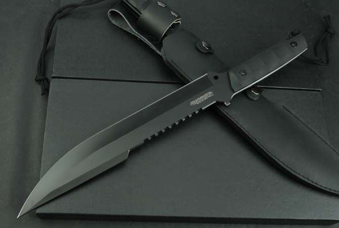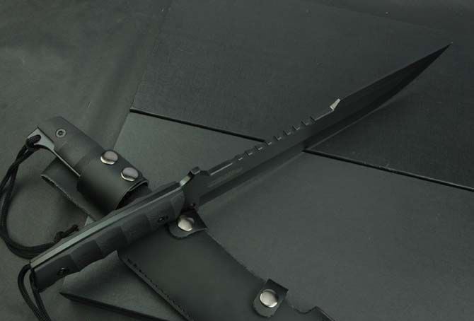 全 长:442mm 刃 长:295mm 柄 长:130mm 刃 宽:50mm 刃 厚:6.4mm 刃 材:5Cr13Mov 重 量:910g(含包装) 硬 度:57HRC 表 面:氧化黑 柄 材:黑G10 锁 型:定锁 其 他:配皮套和彩盒