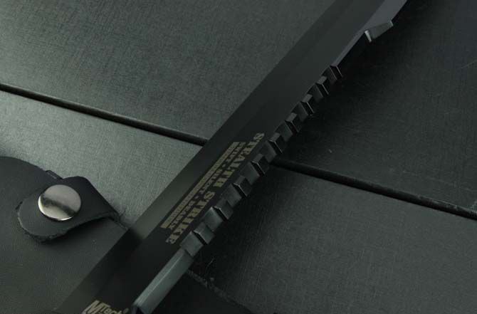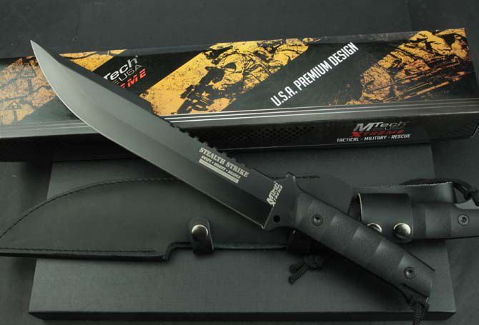 MT—TY09大刀 全 长:442mm 刃 长:295mm 柄 长:130mm 刃 宽:50mm 刃 厚:6.4mm 刃 材:5Cr13Mov 重 量:910g(含包装) 硬 度:57HRC 表 面:氧化黑 柄 材:黑G10 锁 型:定锁 其 他:配皮套和彩盒