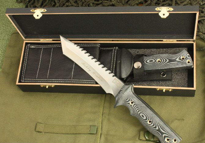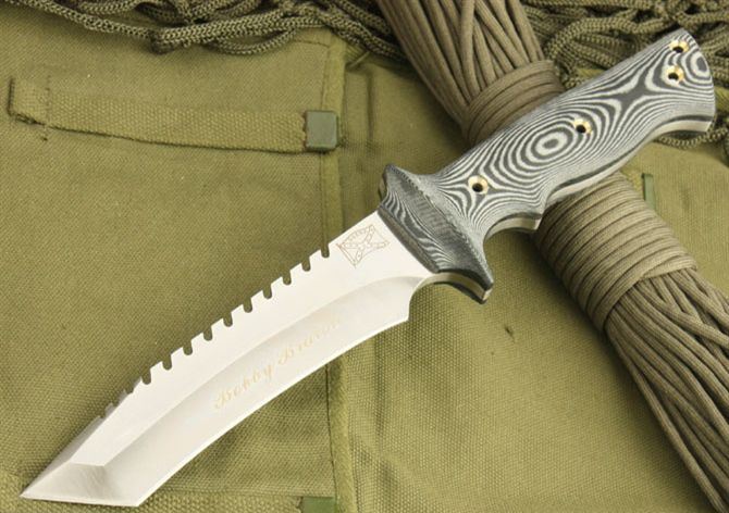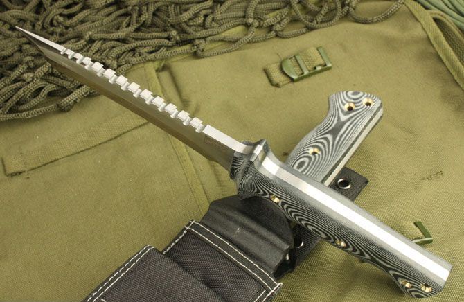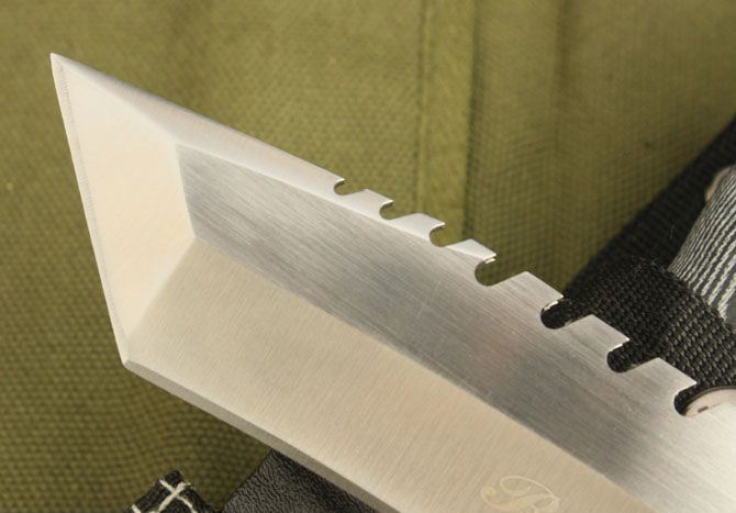 布兰登-MT-1 全长:29cm 刃长:15.5cm 柄长:13.5cm 刃厚:5.9mm 刃宽: 3.5cm 刃材: 5Cr13 柄材: 米克塔 硬度: 56HRC 净重:420克 毛重:840克 表面处理:手工砂光 刀套:ABS+尼龙布