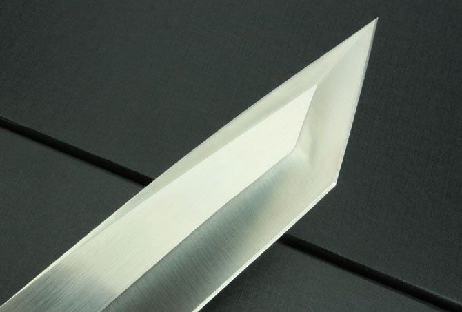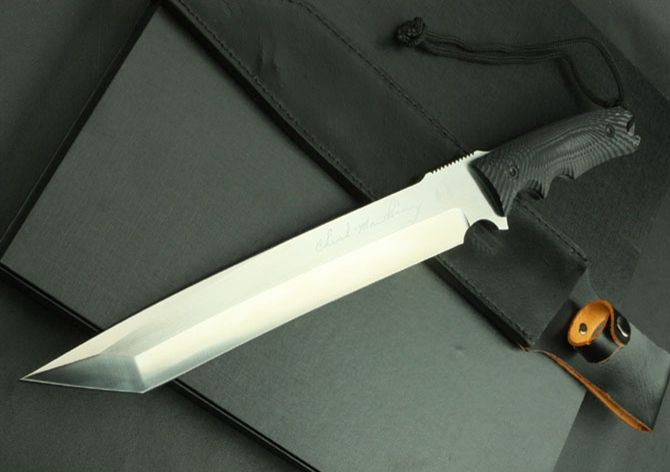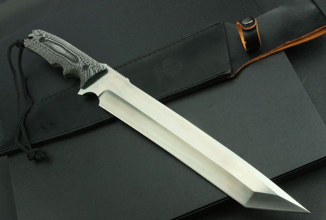 米克—TY23直刀 全 长:445mm 刃 长:285mm 柄 长:140mm 刃 宽:43mm 刃 厚:6.2mm 刃 材:5Cr13Mov 重 量:860g(含包装) 硬 度:57HRC 表 面:砂光 柄 材:双色G10 锁 型:定锁 其 他:配牛皮套和木盒