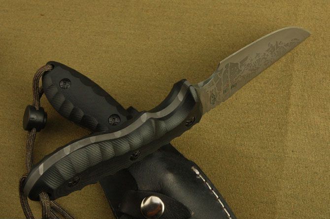 第二代菊花猎刀 全长:240mm 刃长:115mm 刃厚:4.5mm 刃宽: 40mm 刃材: 7Cr17 柄材: 黑G10 硬度: 56-58HRC 总重:360 克(含刀鞘) 刀套:皮套这是一款仿日本刀匠松田菊男的花纹刀,由最初的喜爱,好奇到自己慢慢去摸索工艺,推出了这款花纹刀,在此对菊男先生表示敬意。 为了更满足刀友对刀具内在本质的日渐苛刻的追求,这款刀选用了高端技术和好材质,让刀更完美。