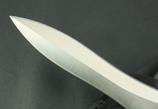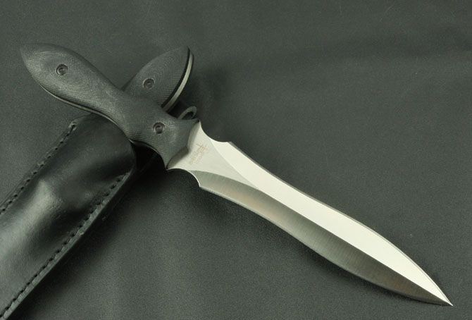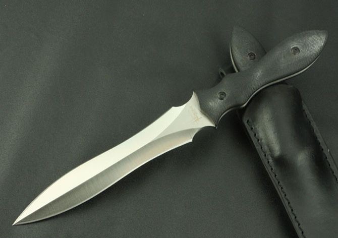 托德·贝格双锋 全 长:288mm 刃 长:150mm 柄 长:120mm 刃 宽:28mm 刃 厚:4.5mm 刃 材:7Cr17Mov 重 量:300g(含包装) 硬 度:57HRC 表 面:砂光 柄 材:黑G10 锁 型:定锁 其 他:配牛皮套和白盒