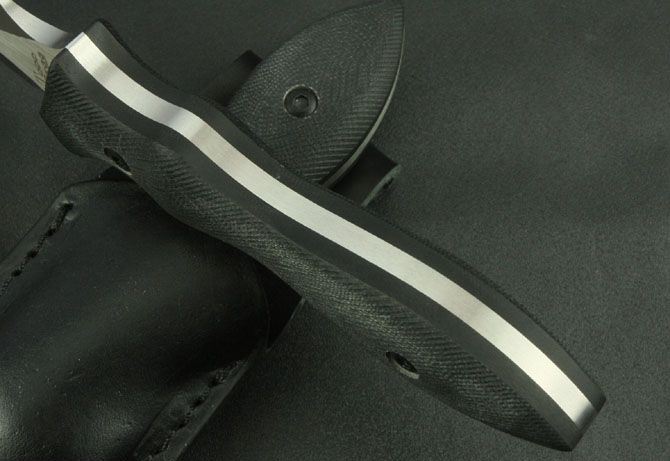 全 长:288mm 刃 长:150mm 柄 长:120mm 刃 宽:28mm 刃 厚:4.5mm 刃 材:7Cr17Mov 重 量:300g(含包装) 硬 度:57HRC 表 面:砂光 柄 材:黑G10 锁 型:定锁 其 他:配牛皮套和白盒