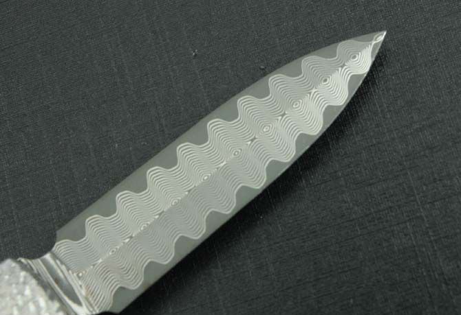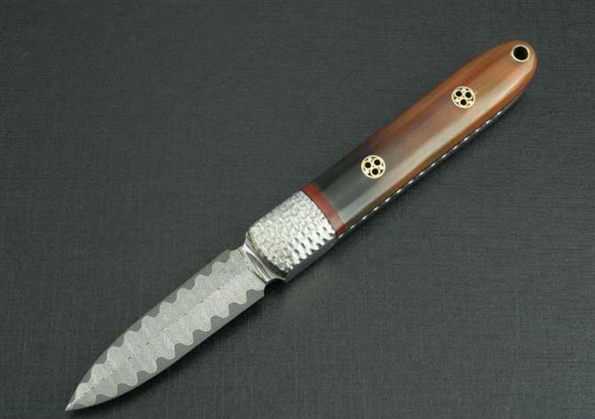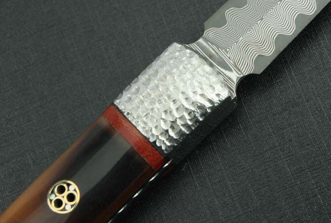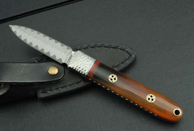全 长:150mm 刃 长:55mm 柄 长:90mm 刃 宽:15mm 刃 厚:2mm 刃 材:大马士革 重 量:85g(含包装) 硬 度:58HRC 表 面:钢本色 柄 材:花牛角 锁 型:定锁 其 他:配牛皮套