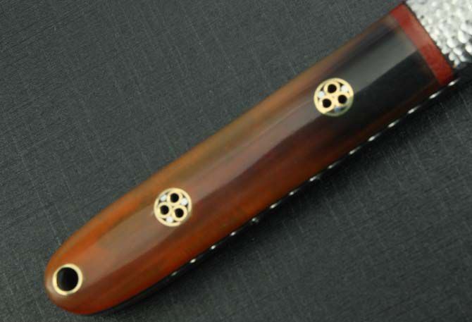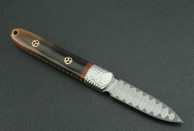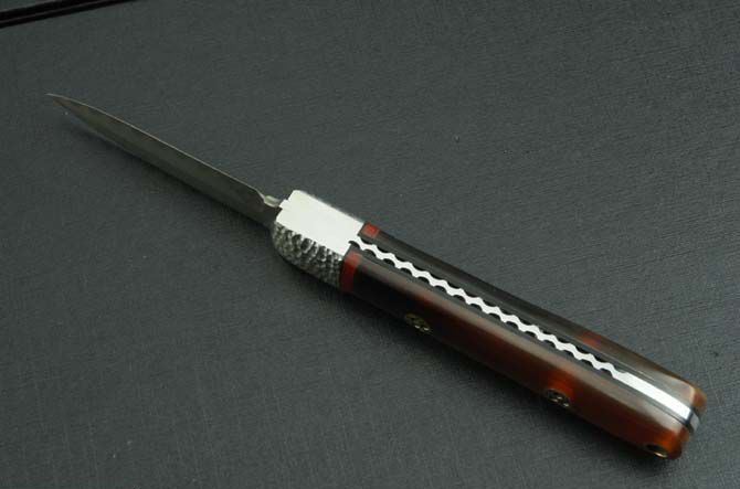 大马士革.单刃茶叶刀(两色可选) 全 长:150mm 刃 长:55mm 柄 长:90mm 刃 宽:15mm 刃 厚:2mm 刃 材:大马士革 重 量:85g(含包装) 硬 度:58HRC 表 面:钢本色 柄 材:花牛角 锁 型:定锁 其 他:配牛皮套