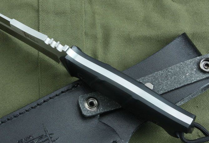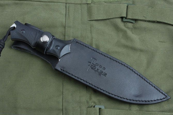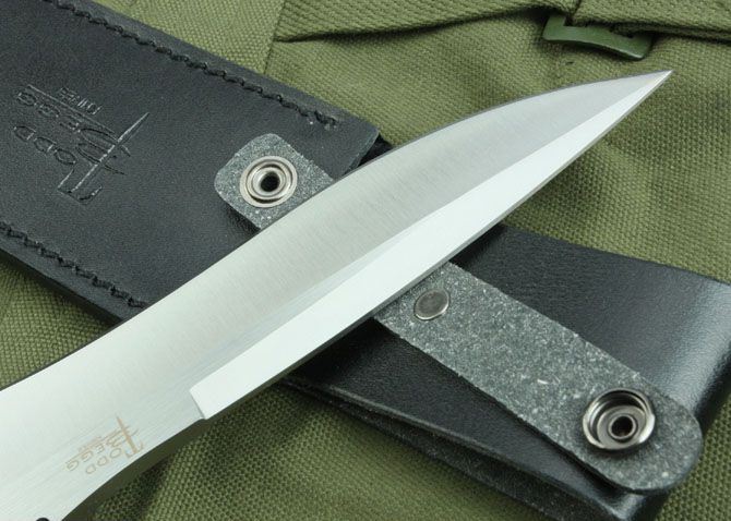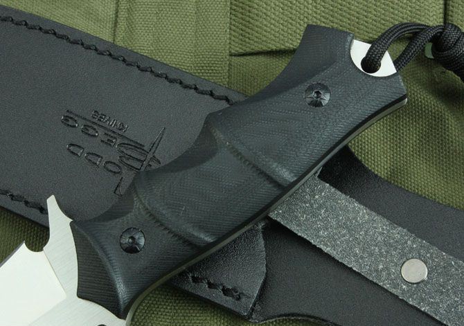 托德·贝格—二龙神 全 长:290mm 刃 长:165mm 柄 长:120mm 刃 宽:35mm 刃 厚:5.1mm 刃 材:5Cr13Mov 重 量:460g(含包装) 硬 度:57HRC 表 面:砂光 柄 材:黑色G10 锁 型:定锁 其 他:配牛皮套+牛皮纸盒