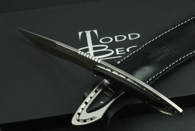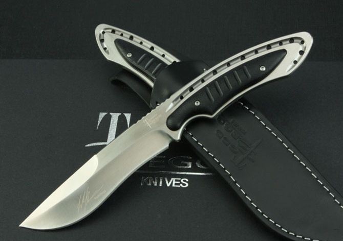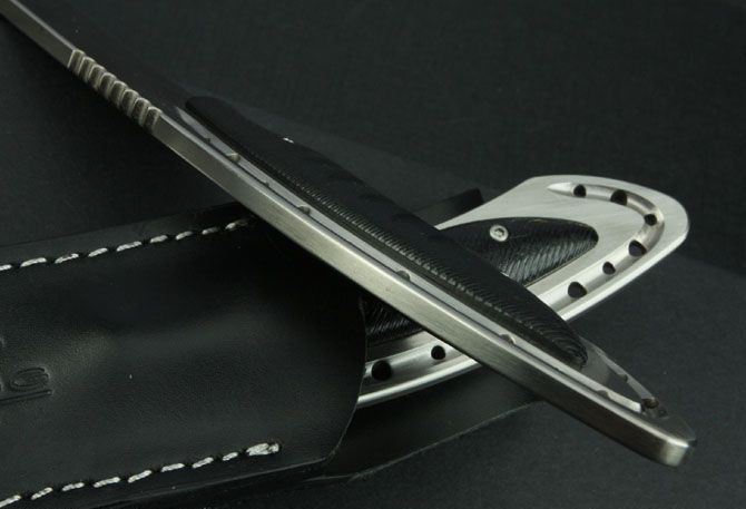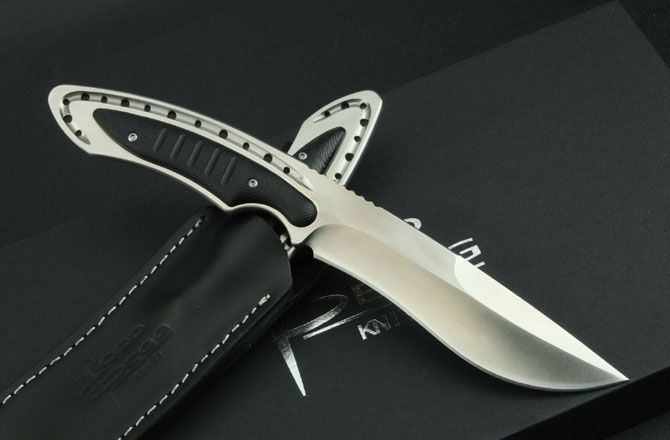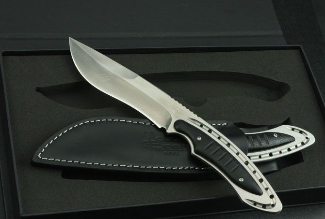 托德·贝格—鳗鱼直刀 全 长:238mm 刃 长:120mm 柄 长:115mm 刃 宽:30mm 刃 厚:4.6mm 刃 材:9Cr13Mov 重 量:190g(含包装) 硬 度:59HRC 表 面:砂光 柄 材:G10 锁 型:定锁 其 他:配牛皮套+黑色硬纸盒