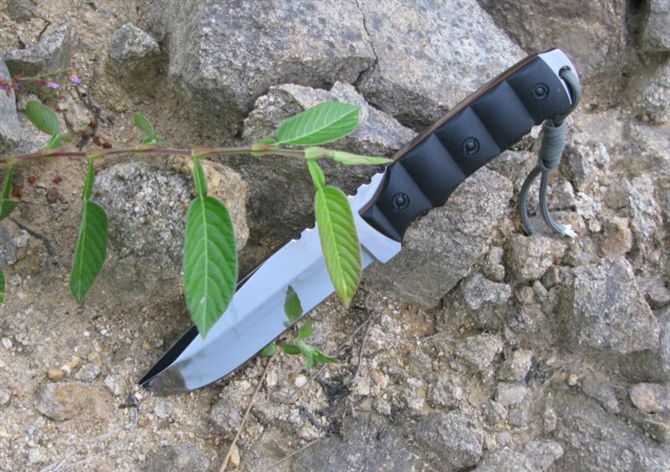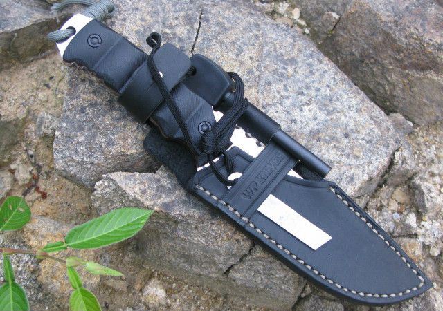 全 长:255mm 刃 长:130mm 刃 宽:35mm 刃 厚:5mm 刀净重:300克 刃 材:AUS-10A 硬 度:58-59HRC{真空热处理) 表 面:钢本色,镜光效果 柄 材:黑色G10,CNC 3D成型,夹层为橙色G10 刀 鞘:手工进口头层牛皮刀鞘(黑色) 出 品:德国彪牌OEM