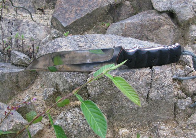 威鹏天蚕大背牙版 全 长:255mm 刃 长:130mm 刃 宽:35mm 刃 厚:5mm 刀净重:300克 刃 材:AUS-10A 硬 度:58-59HRC{真空热处理) 表 面:钢本色,镜光效果 柄 材:黑色G10,CNC 3D成型,夹层为橙色G10 刀 鞘:手工进口头层牛皮刀鞘(黑色) 出 品:德国彪牌OEM