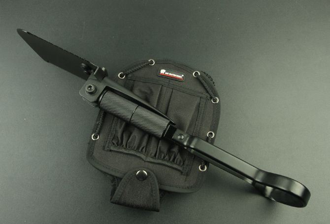 汉道—折叠工兵铲 全 长: 47cm 刃 长: 10cm 柄 长: 30.5cm 刃 厚: 1.4cm 刃 材: 440 不锈钢 硬 度: 56 HRC 净 重: 900g(含包装) 表 面: 氧化黑 其 他:全刃开锋,配尼龙套