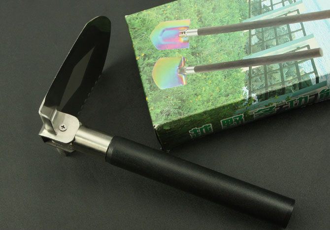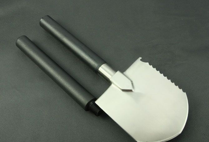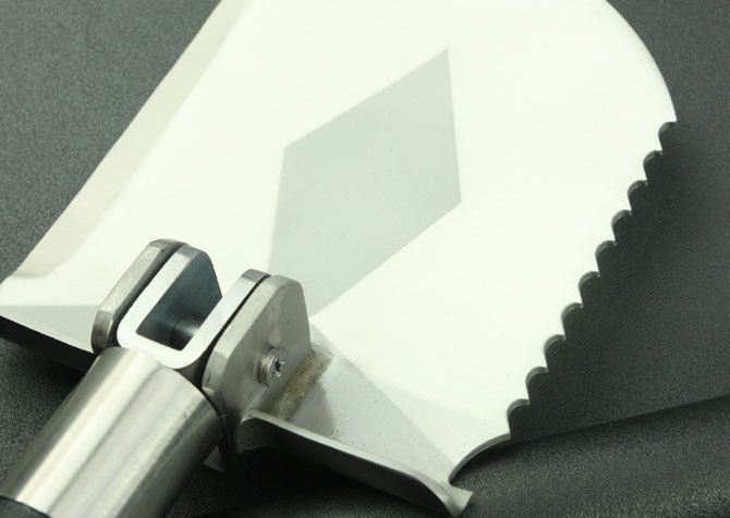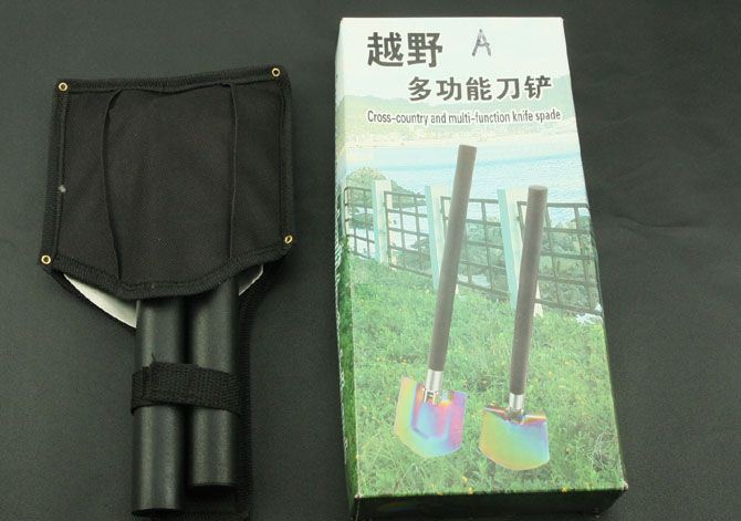 越野多功能铲(有牙) 全 长:535mm 刃 长:85mm 柄 长:400mm 刃 宽:107mm 刃 厚:1.9mm 刃 材:3Cr13Wov 重 量:900g(含包装) 硬 度:55HRC 表 面:砂光 柄 材:尼龙+纤(分三节) 锁 型:定锁 其 他:配尼龙和彩盒套
