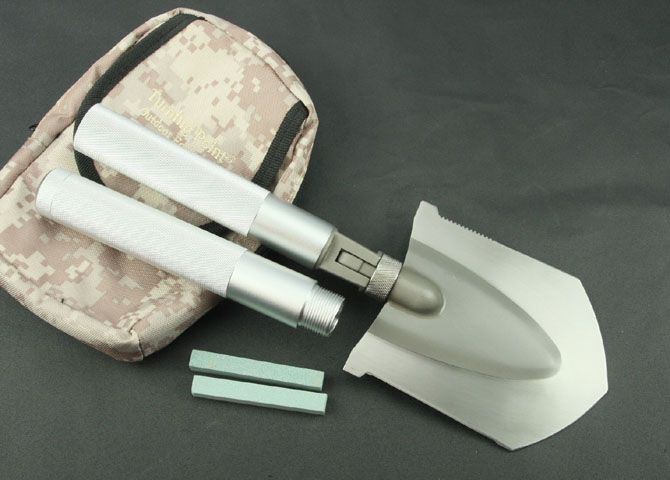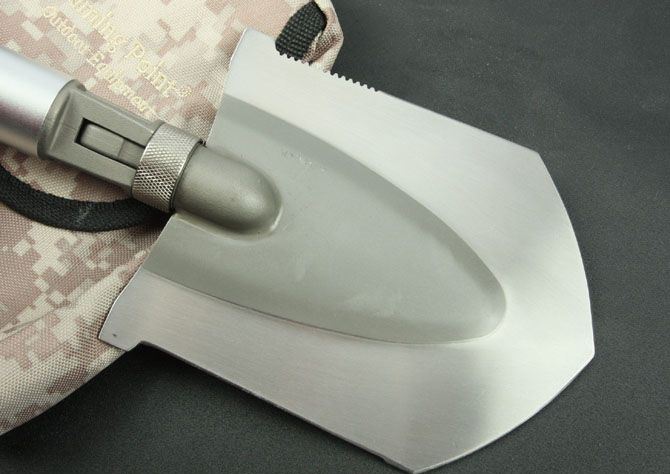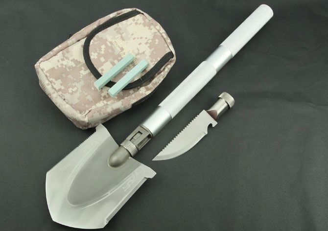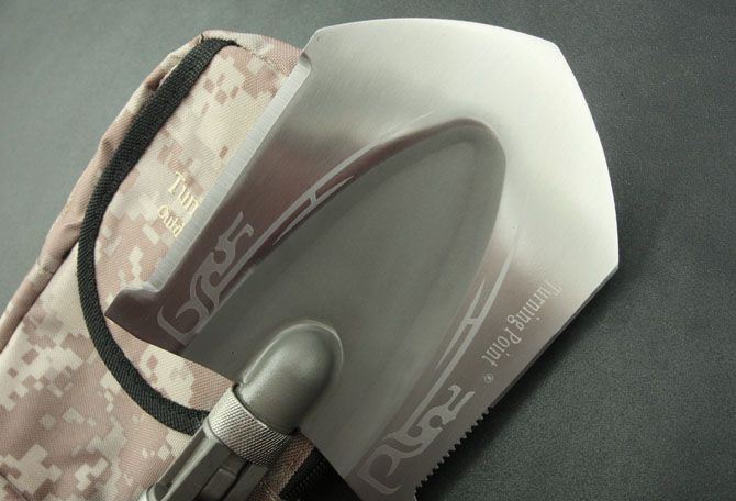 全 长:485mm 刃 长:铲80mm 刀90mm 柄 长:305mm 刃 宽:铲105mm 刀30mm 刃 厚:1.9mm 刃 材:5Cr13Wov 重 量:900g(含包装) 硬 度:56HRC 表 面:砂光 柄 材:铝柄(分三节) 锁 型:定锁 其 他:配尼龙和彩盒套