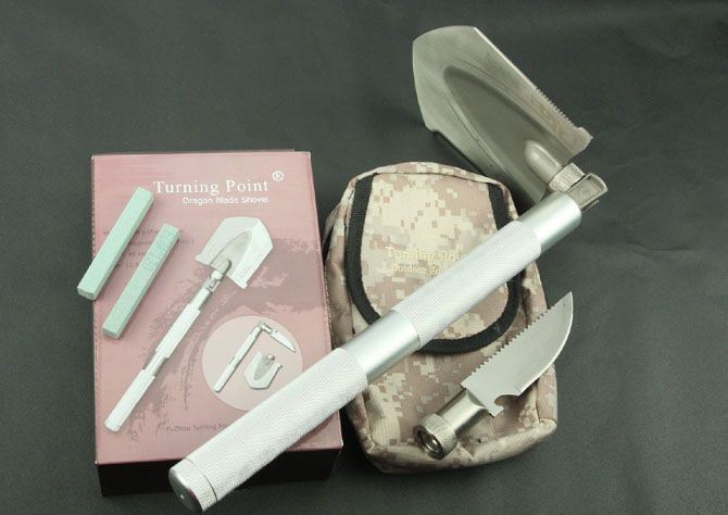 龙纹多功能刀铲 全 长:485mm 刃 长:铲80mm 刀90mm 柄 长:305mm 刃 宽:铲105mm 刀30mm 刃 厚:1.9mm 刃 材:5Cr13Wov 重 量:900g(含包装) 硬 度:56HRC 表 面:砂光 柄 材:铝柄(分三节) 锁 型:定锁 其 他:配尼龙和彩盒套