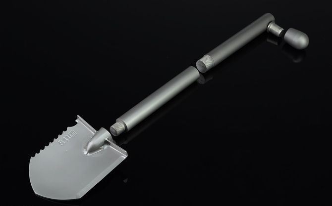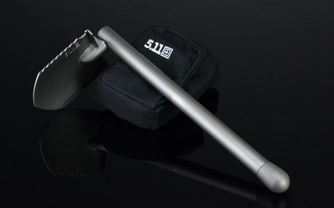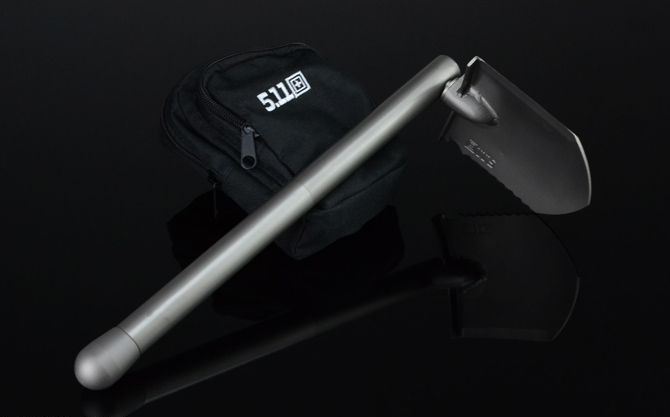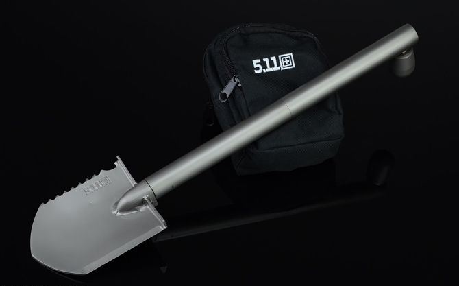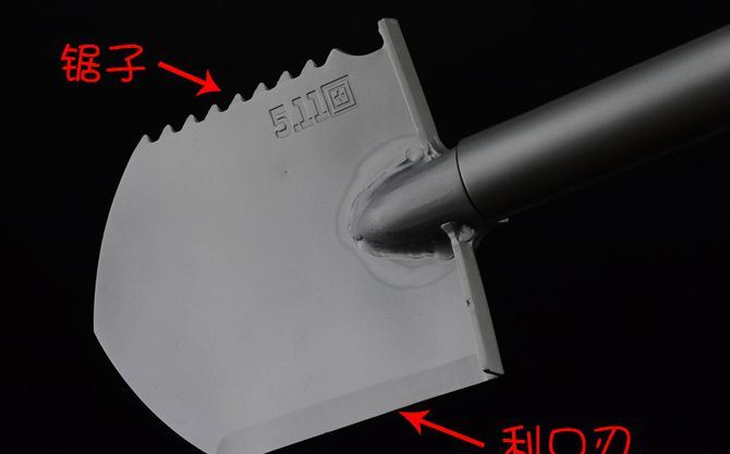 5.11户外工兵铲(银白版) 长 度:41.5cm 宽 度:9.5cm 刃 厚:1.9mm 刃 材:高碳钢 硬 度:58HRC 表 面:喷银色 重 量:780克(含尼龙套、彩盒) 备注:带尼龙袋、彩盒。 主要功能: 1、利口刀 2、木锯 3、锤子 4、可转换成锄头 5、开瓶器