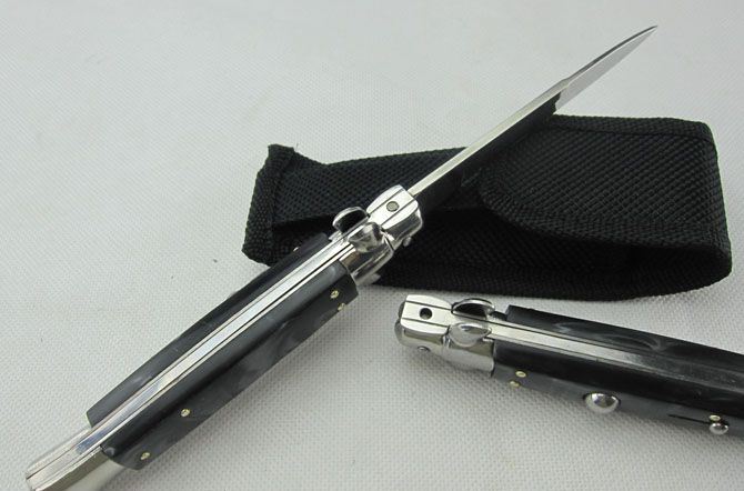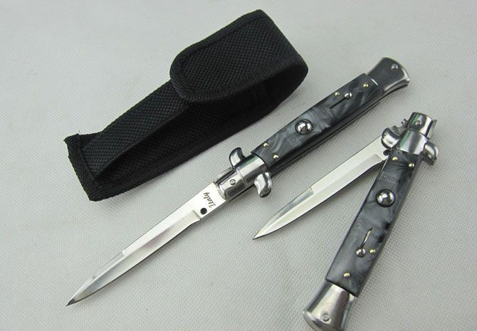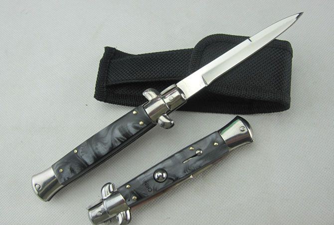 意大利FOX.黑手党侧跳(乌云柄) 全 长:22.0cm 刃 长:8.0cm 柄 长:12.5cm 刃 宽:1.2cm(最宽处) 刃 厚:3.0mm 刃 材:440 硬 度:55HRC 刀 柄:树脂柄片 表 面:镜光 开刀方式:自动横出 重 量:120.0克 备 注:带尼龙袋