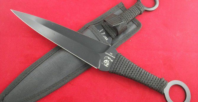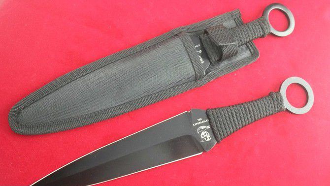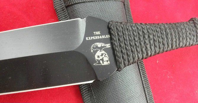 expendable I敢死队飞刀(两支)出口版 全长:30.5CM 刃长:17CM 刃厚:0.5CM 最宽:4.2CM 柄材料:一体缠粗绳子 刃材料:420不锈钢 表面:焗黑漆面 重量:185克(单只) 刀鞘:尼龙(两支)