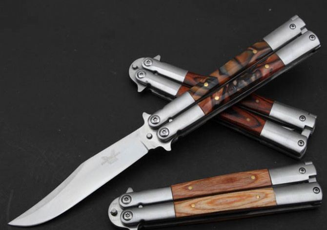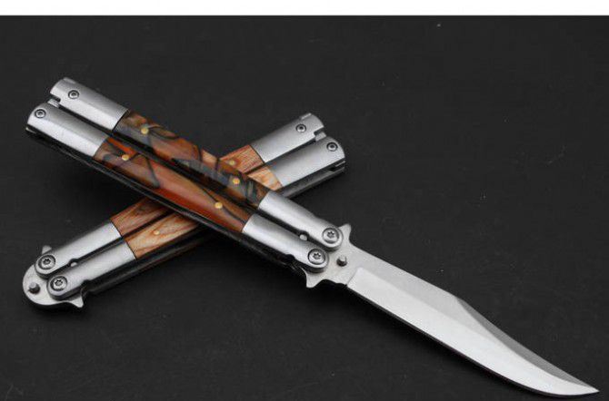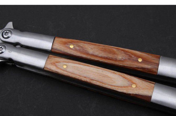 蝴蝶—CAT甩刀(原木柄+树脂柄+彩木柄) 全长:22.3cm 刃长:10.3cm 柄长:12.0cm 刃宽: 2.0cm 刃材: 5Cr13MoV 柄材: 彩木+钢头 硬度: 56HRC 重量: 125克 表面处理:沙光