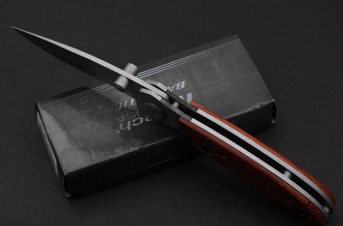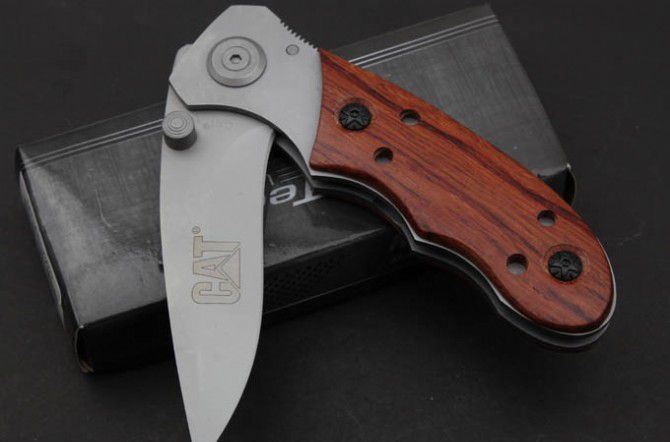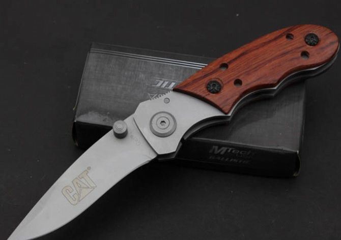 CAT001折刀 全 长:220mm 刃 长:95mm 柄 长:125mm 刃 宽:28mm 刃 厚:2.9mm 刃 材:3Cr13 重 量:210(含包装) 硬 度:55HRC 表 面:镀钛 柄 材:红木柄 锁 型:线锁 其 他:牛皮纸盒